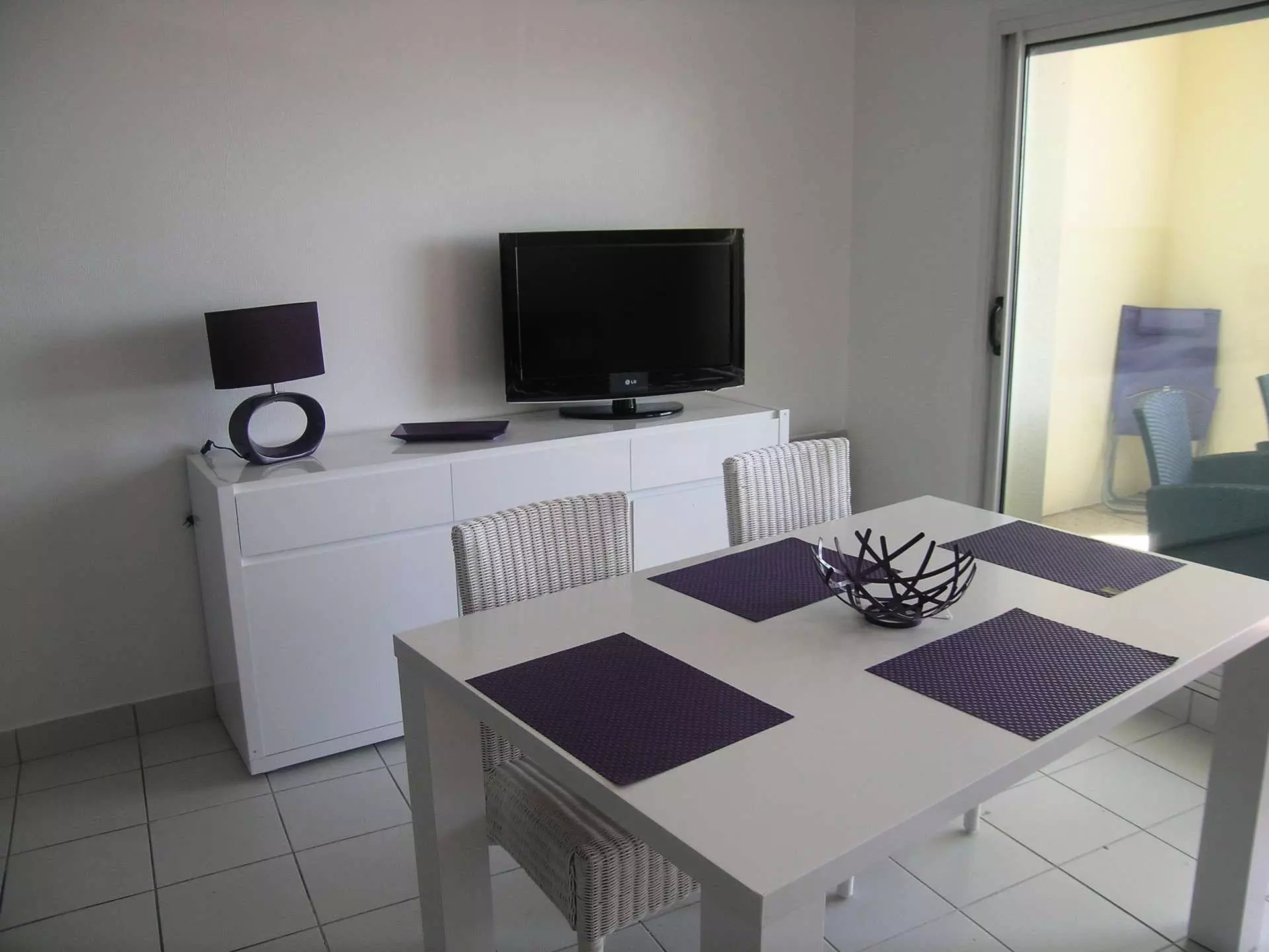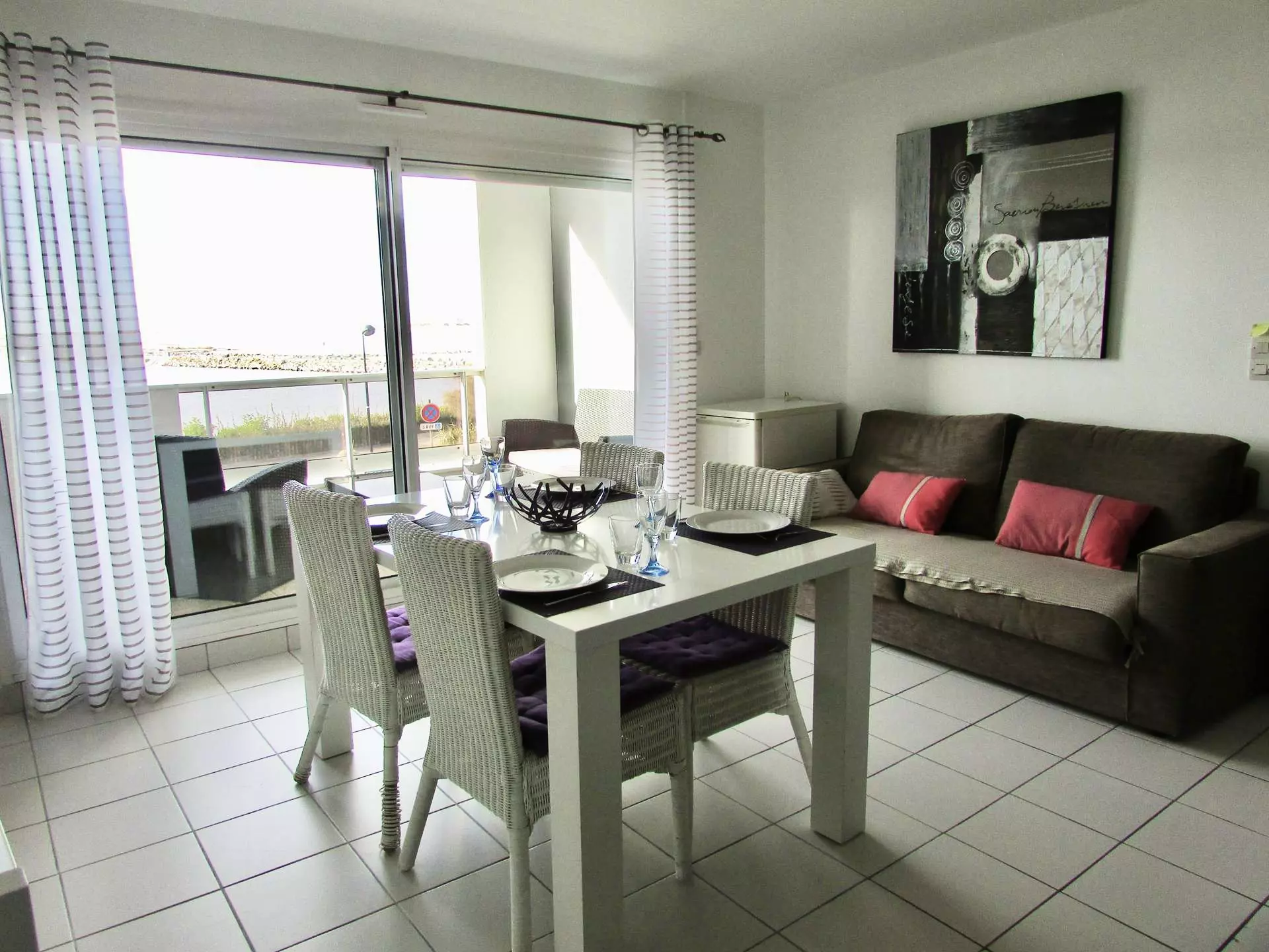 Salon-séjour : télévision, grande baie donnant sur balcon de 8.70 m² exposée sud, vue mer, sans vis à vis avec mobilier de jardin.
