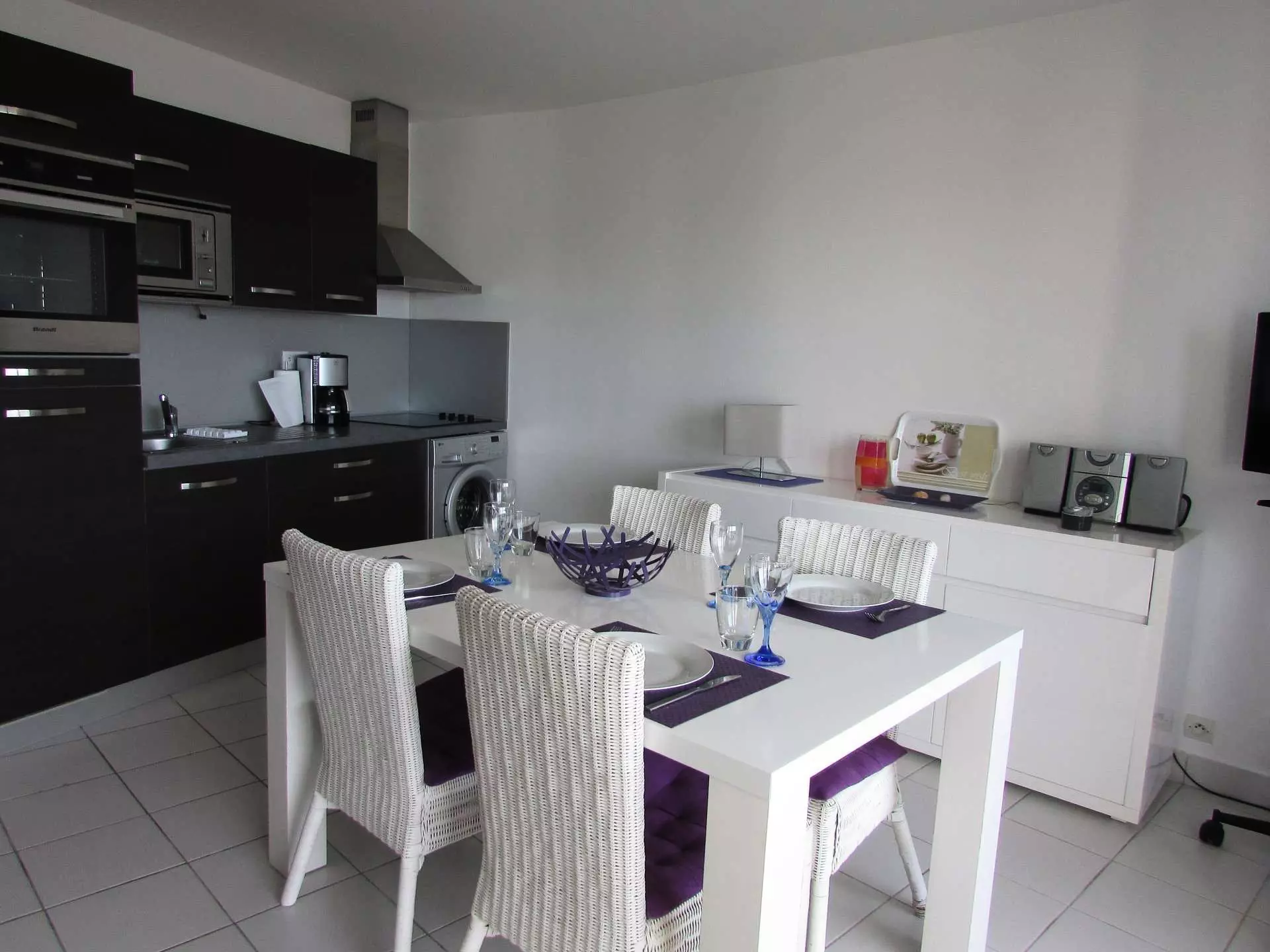 Cuisine aménagée et équipée (four, réfrigérateur, congélateur, plaque induction, lave-linge, hotte, micro-ondes, cafetière, bouilloire, grille-pain), ouverte sur