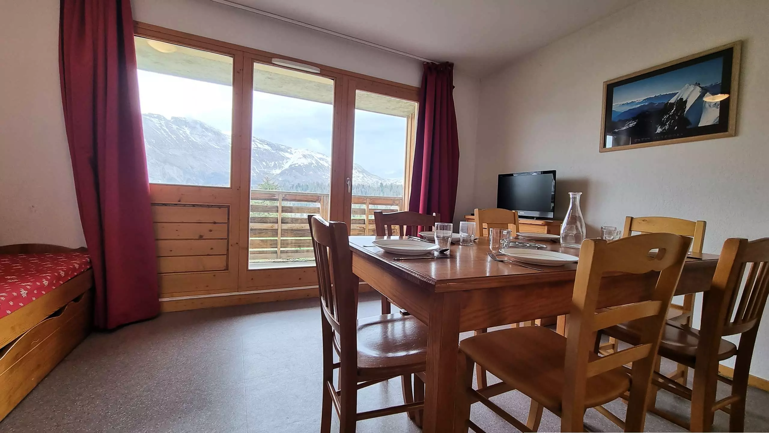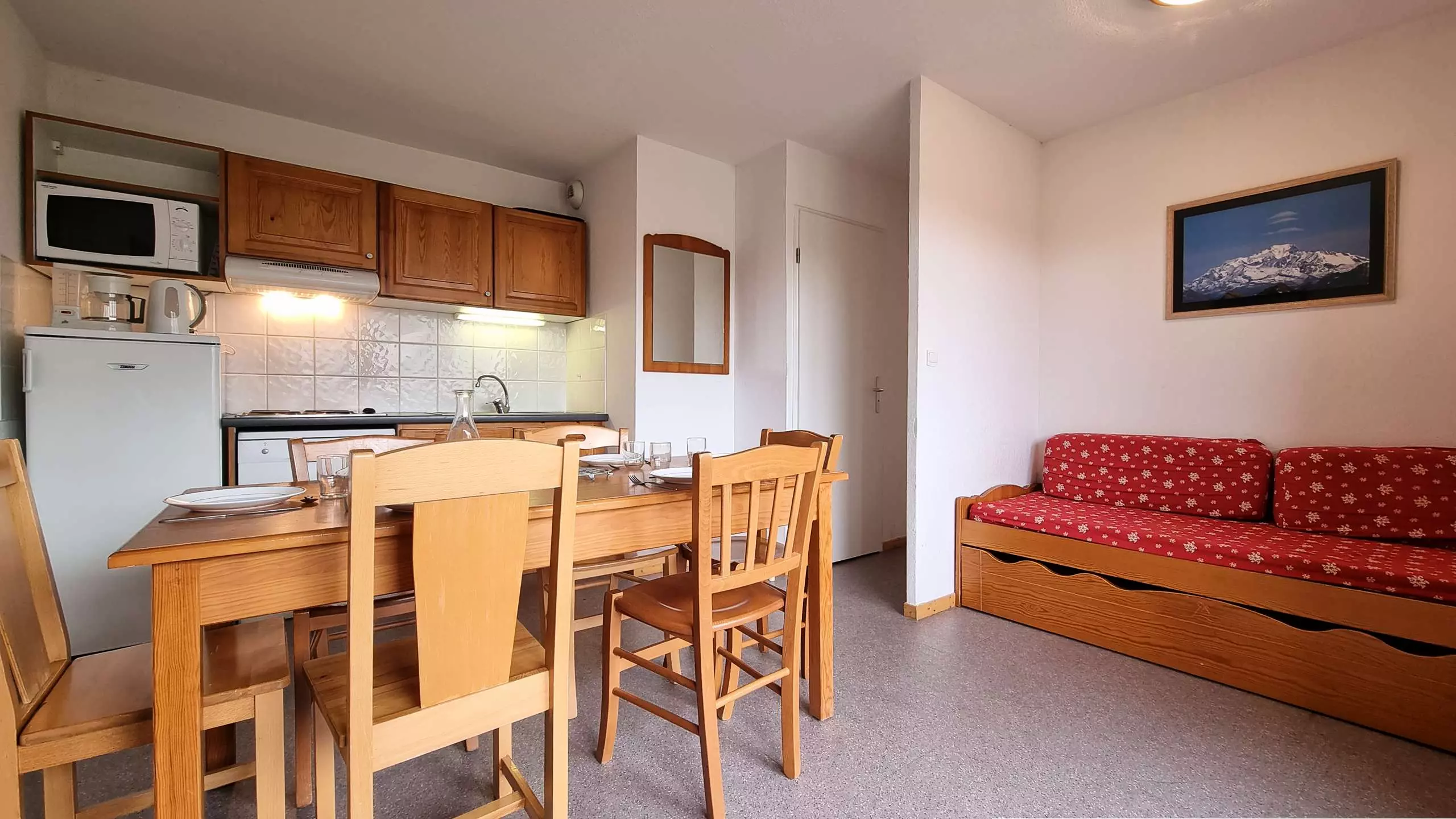 Appartement de 2 pièces avec coin montage pouvant accueillir jusqu'à 4 personnes, exposé est avec balcon, au rez-de-chaussée.
