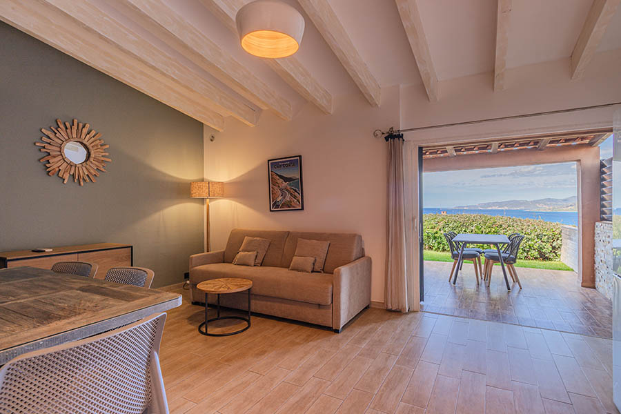 Les mini-villas "Supérieures" (environ 45 m²) accueillent 2 à 4 personnes. Dotées d'une chambre indépendante avec lit Queen size (160x200cm), d'un séjour avec canapé-lit, d'une terrasse couverte avec espace repas et coin gazonné, elles offrent une vue mer remarquable — un parfait pied-à-terre pour un séjour intimiste.