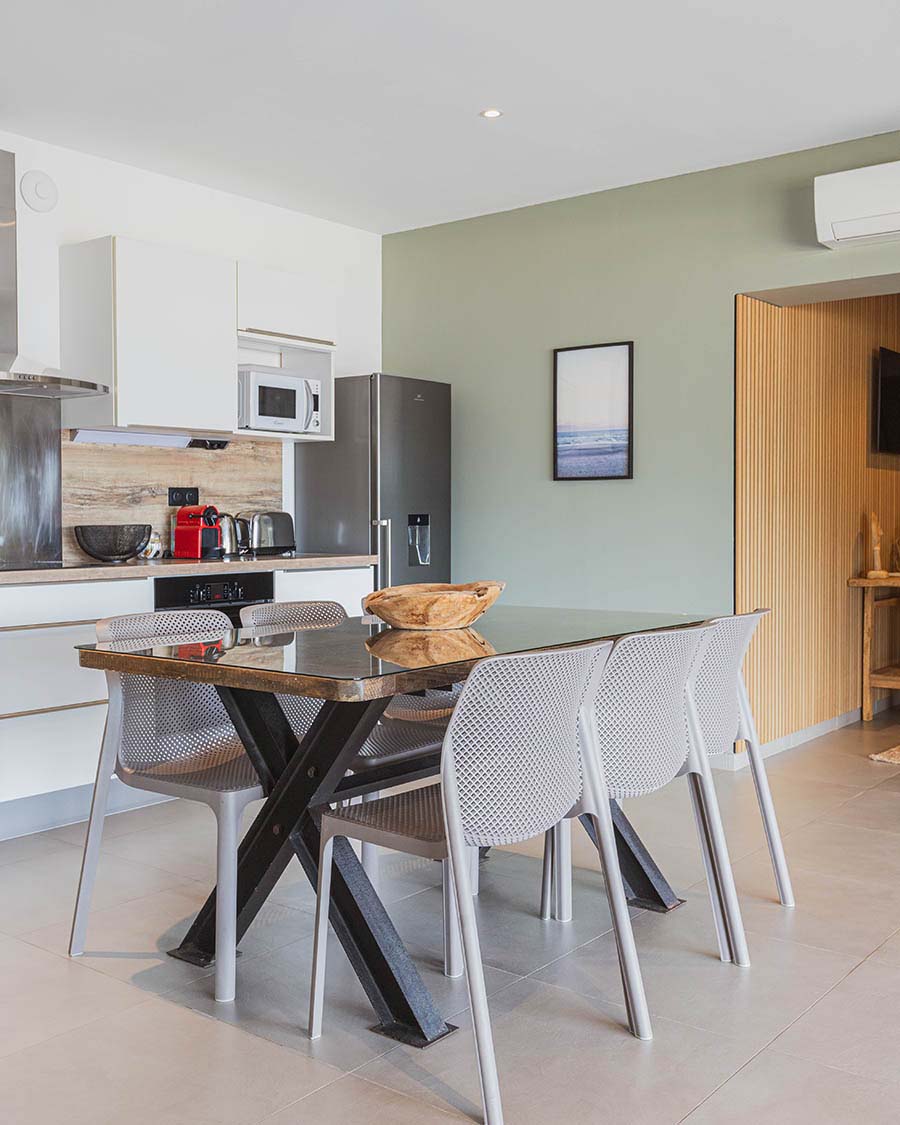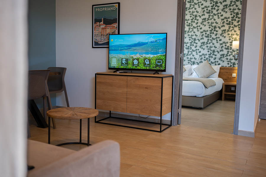 L'appartement "Supérieur" (environ 60 m²), modulable jusqu'à 4 personnes, s'adresse particulièrement aux familles ou couples recherchant un espace plus généreux. Ce logement, accessible aux Personnes à Mobilité Réduite (PMR), offre une chambre indépendante avec lit Queen size (160x200cm), un séjour spacieux avec canapé convertible, cuisine fonctionnelle et terrasse ombragée ouverte sur le golfe.