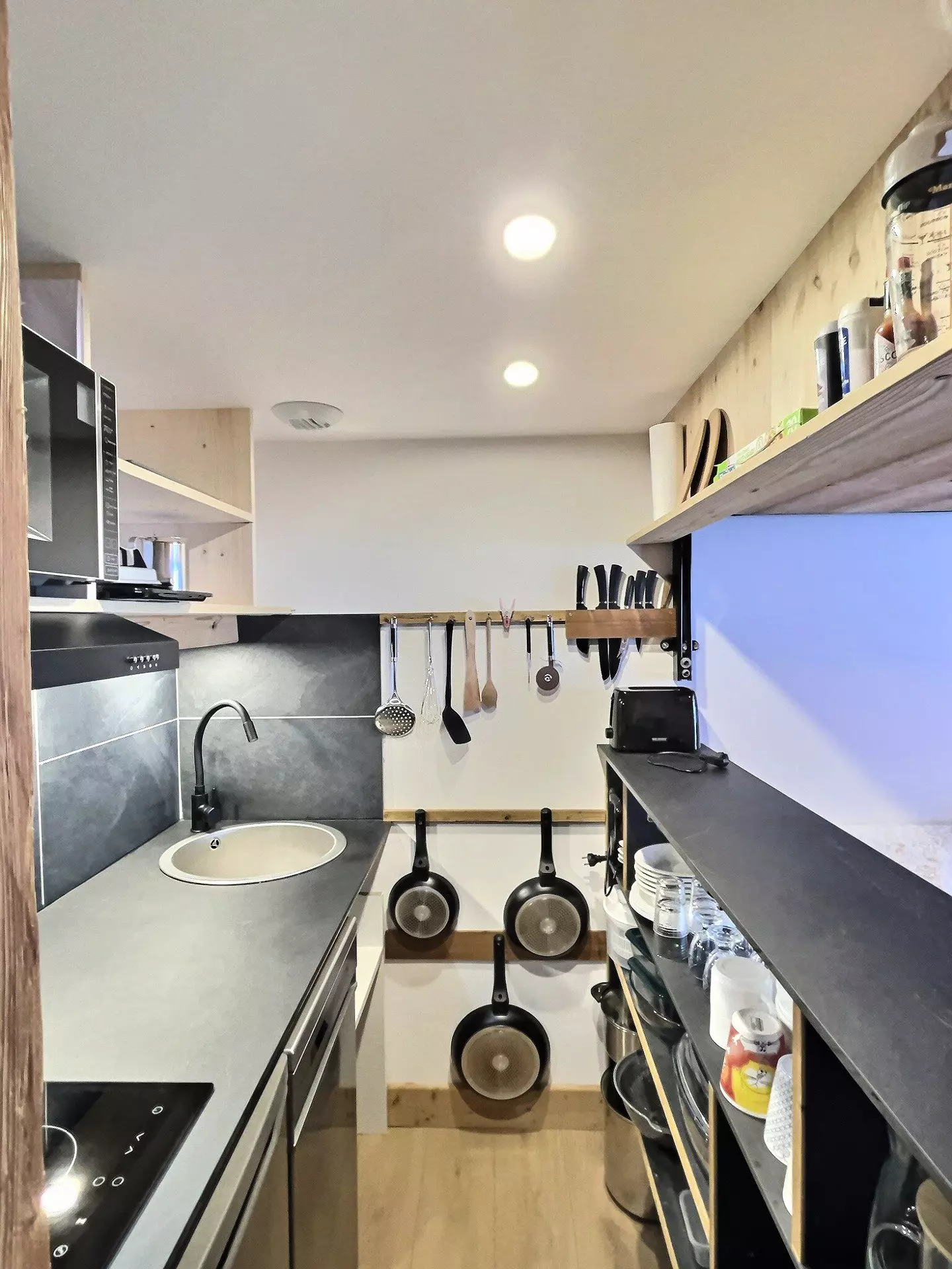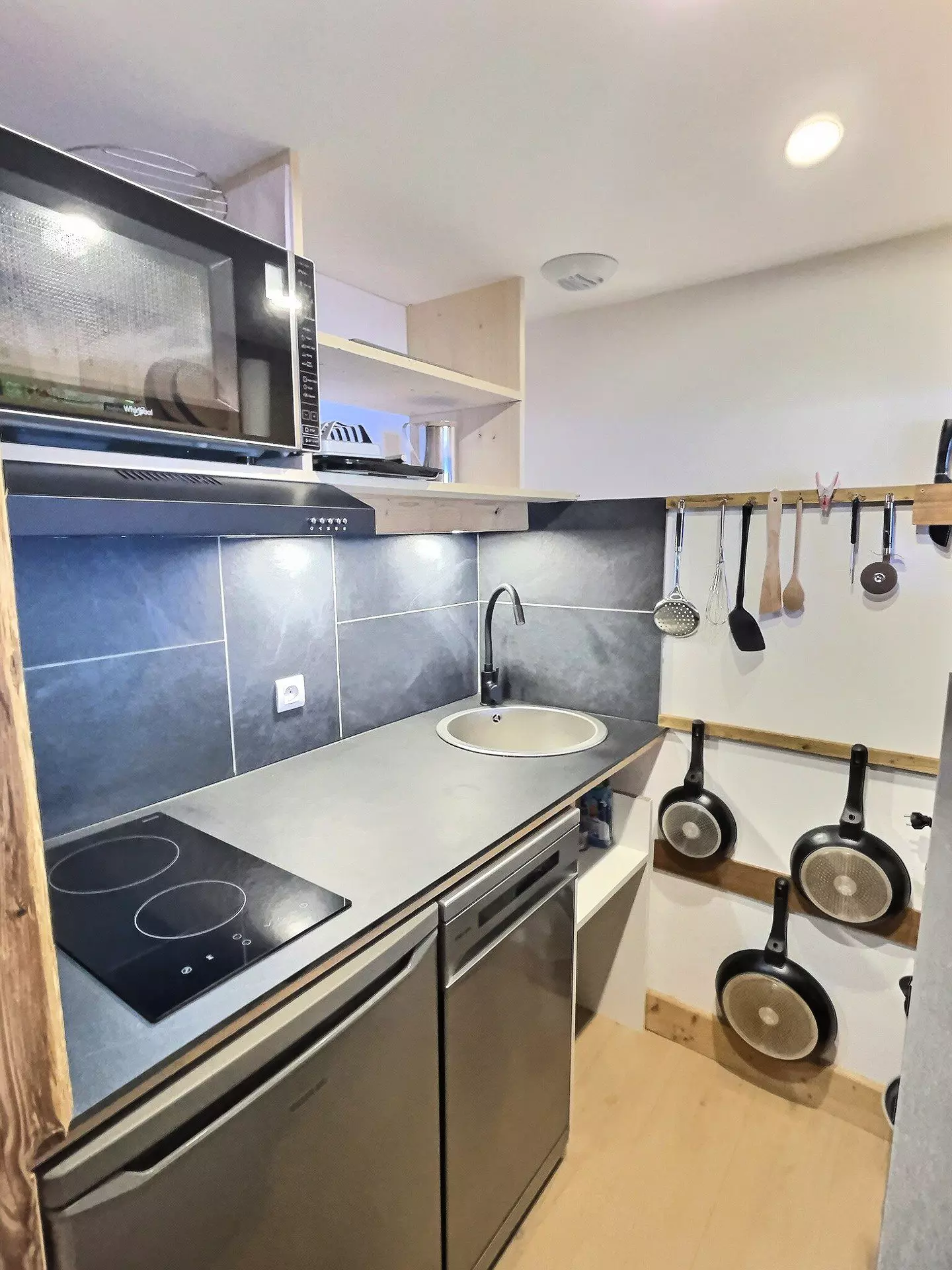 Elle est toute équipée avec des plaques à induction, un combiné four et micro-ondes, un lave-vaisselle et un réfrigérateur.
