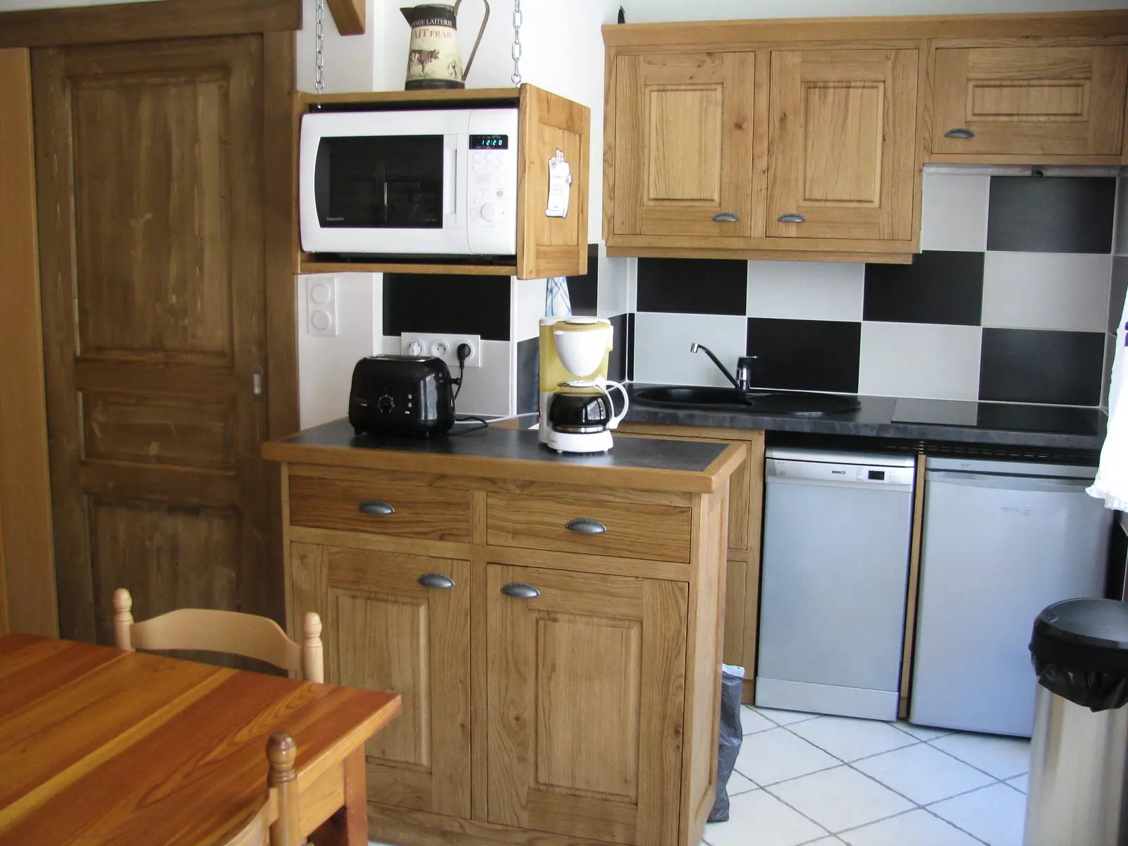 Coin cuisine : combiné réfrigérateur (115 L)/Freezer (25 L) , plaque à induction (4 foyers), micro-ondes, four et lave-vaisselle.