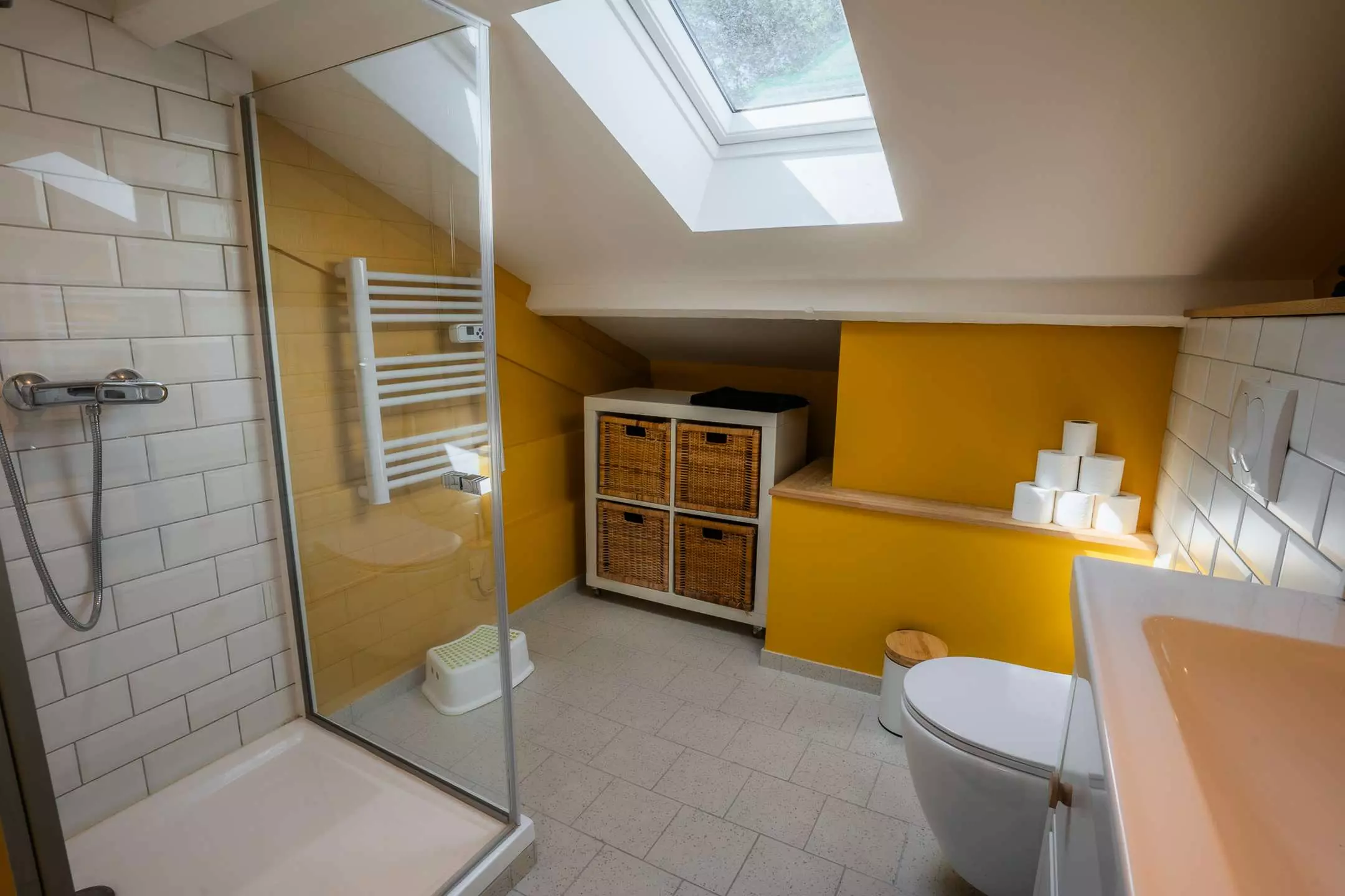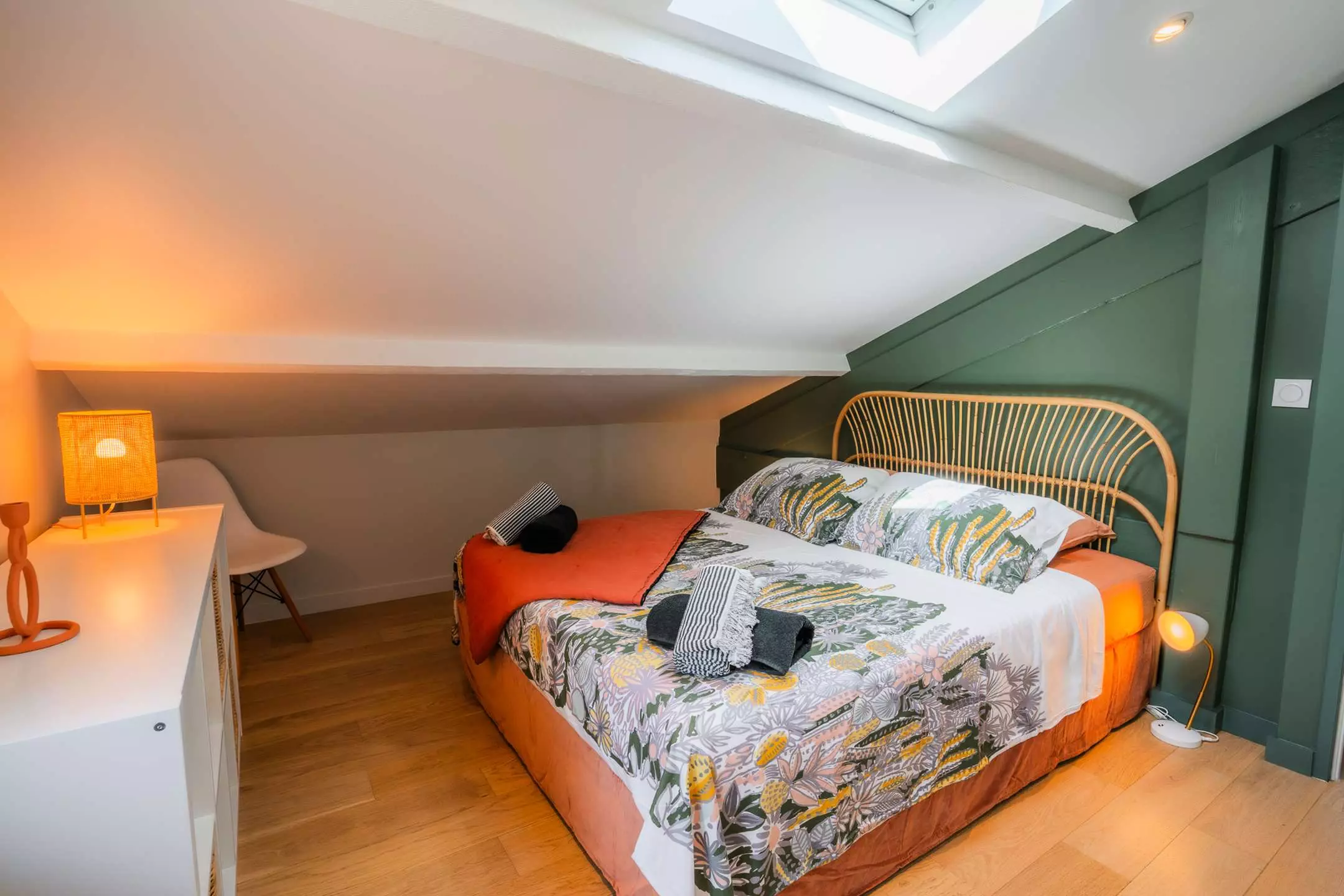 A l'étage, une troisième chambre double climatisée avec un lit Queensize (160*200 cm). Une salle d'eau avec douche avec Wc.
