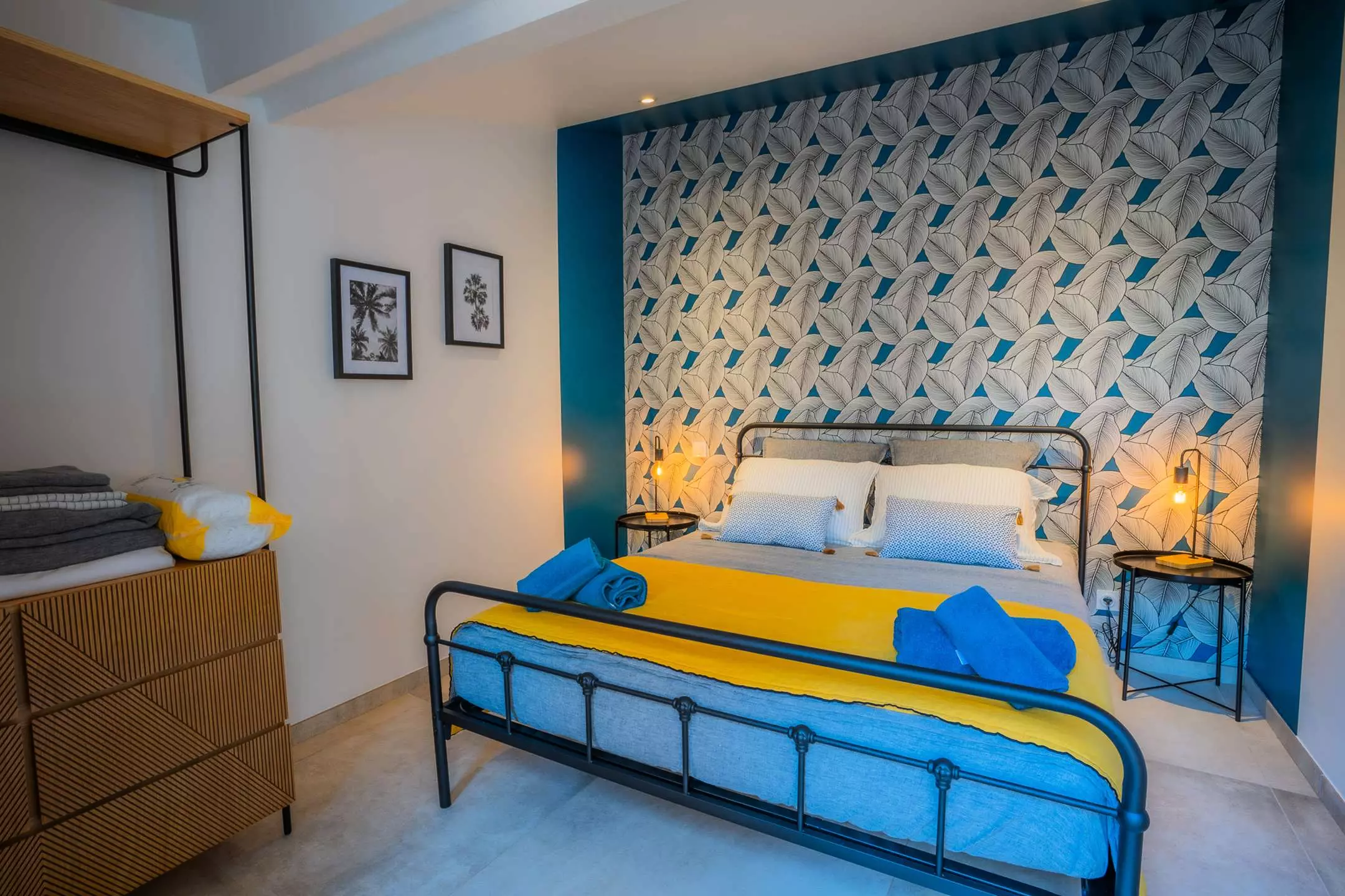 Une première chambre double et climatisée avec un lit double Kingsize(180*200 cm), une salle d'eau et un dressing, un accès au patio et une vue sur la piscine.