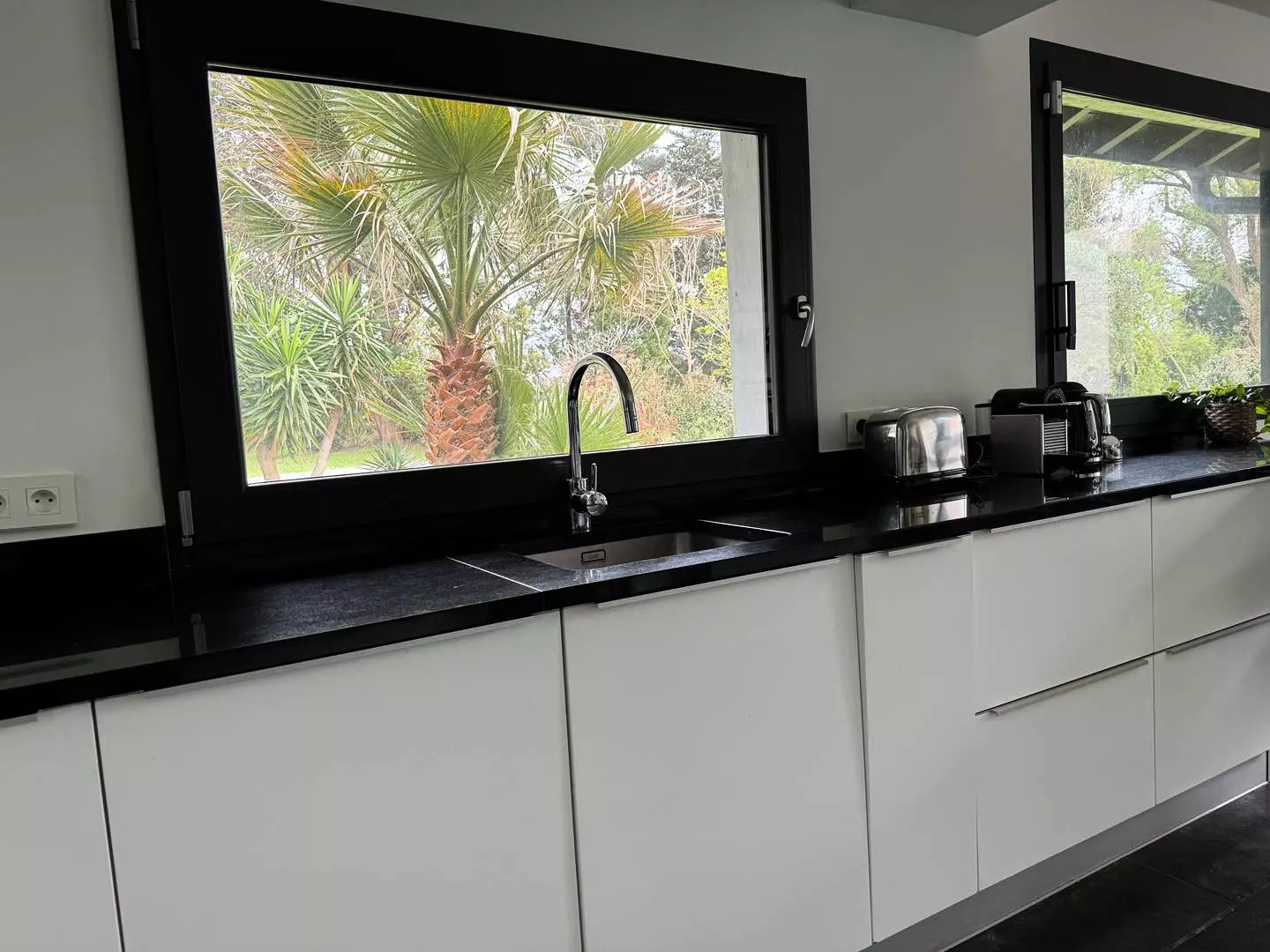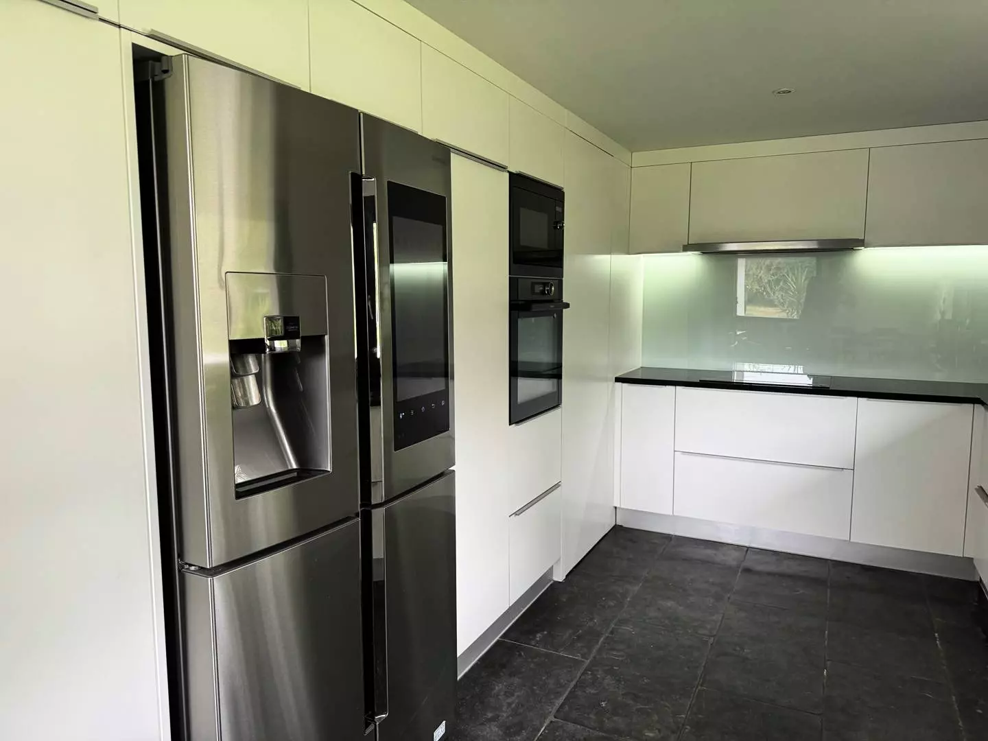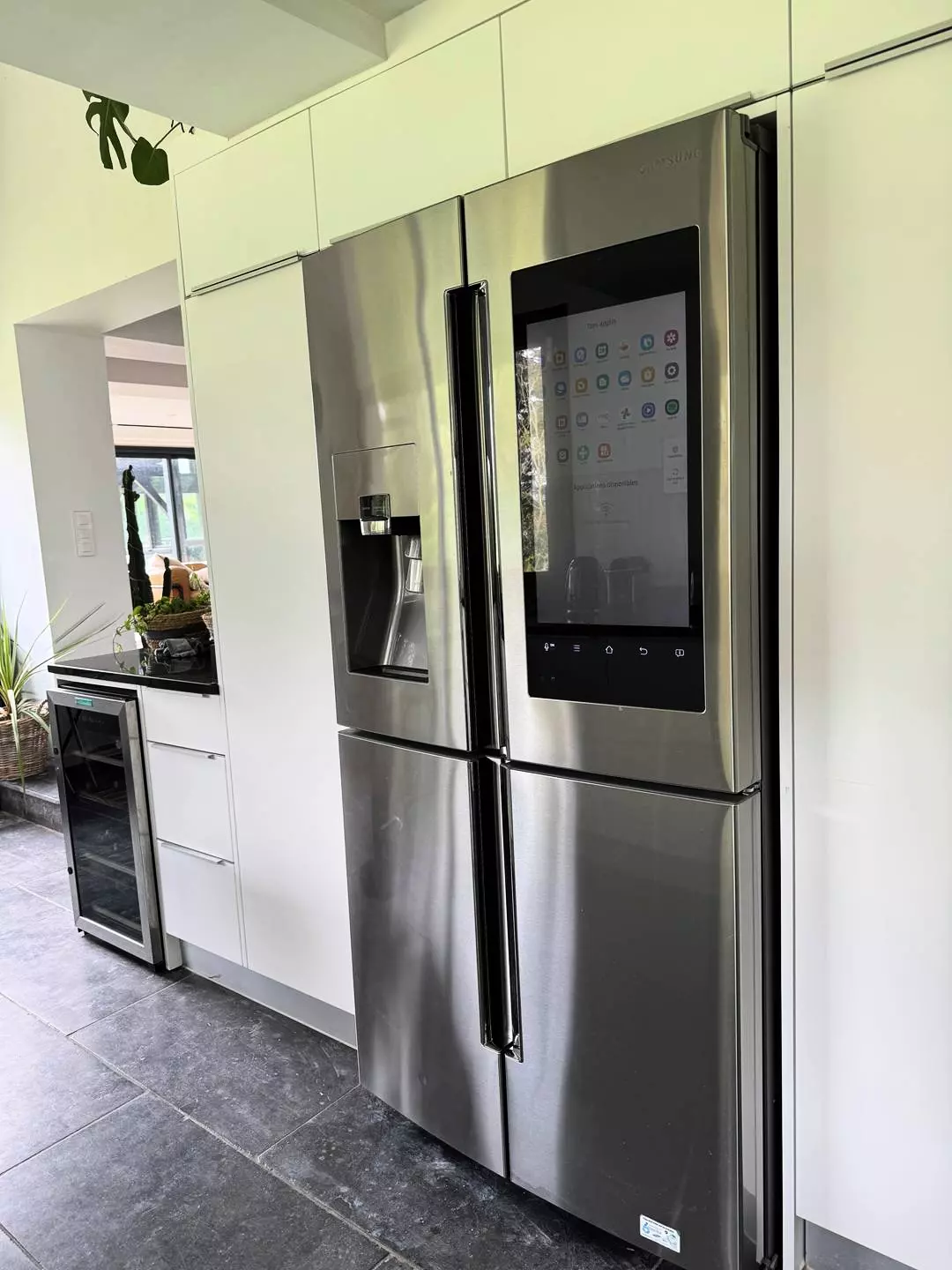 La cuisine, d'une superficie d'environ 20m2, est entièrement équipée avec un réfrigérateur américain connecté, une cave à vins, un four électrique et un lave-vaisselle, idéale pour préparer de délicieux repas en famille ou entre amis.