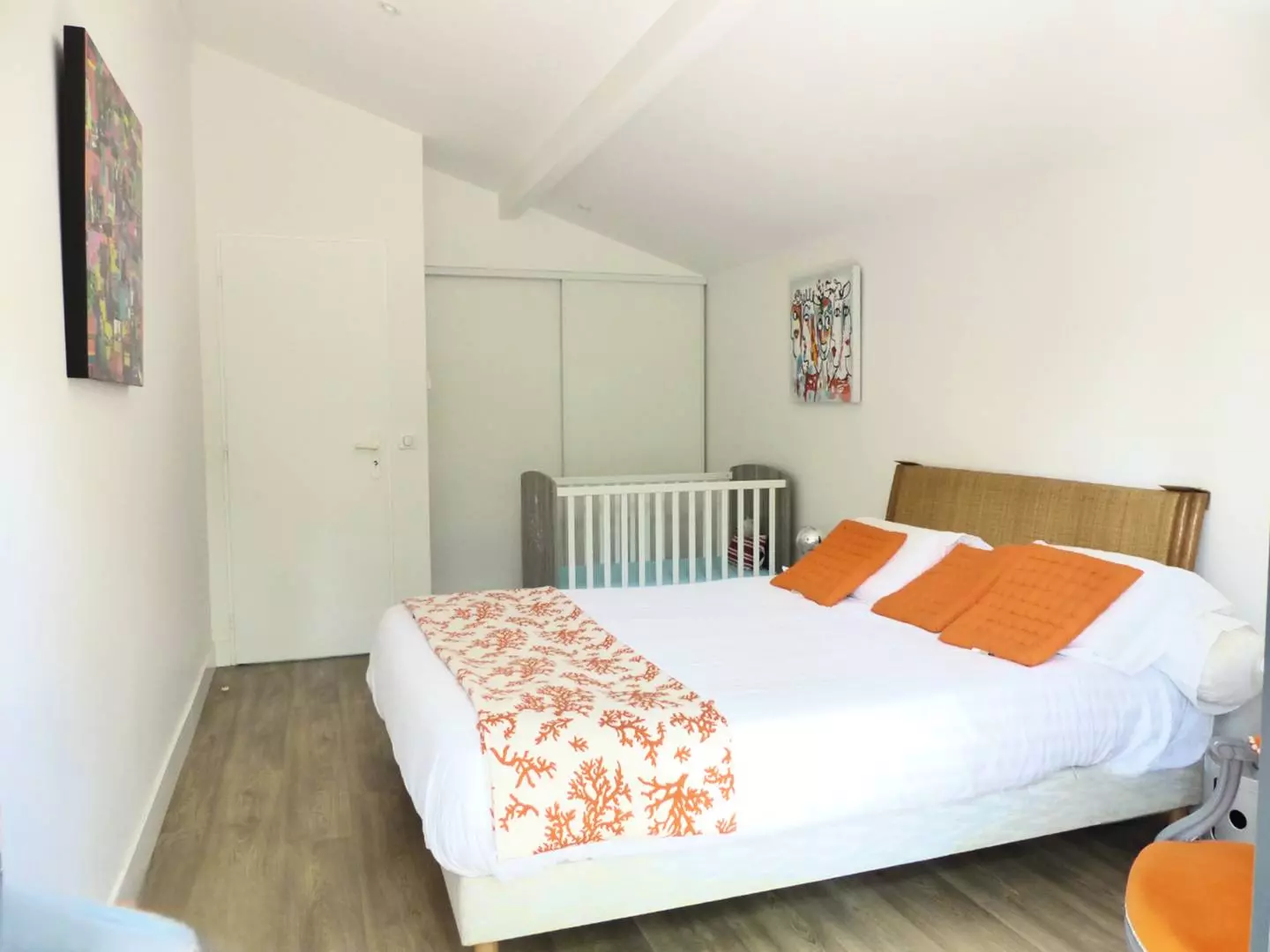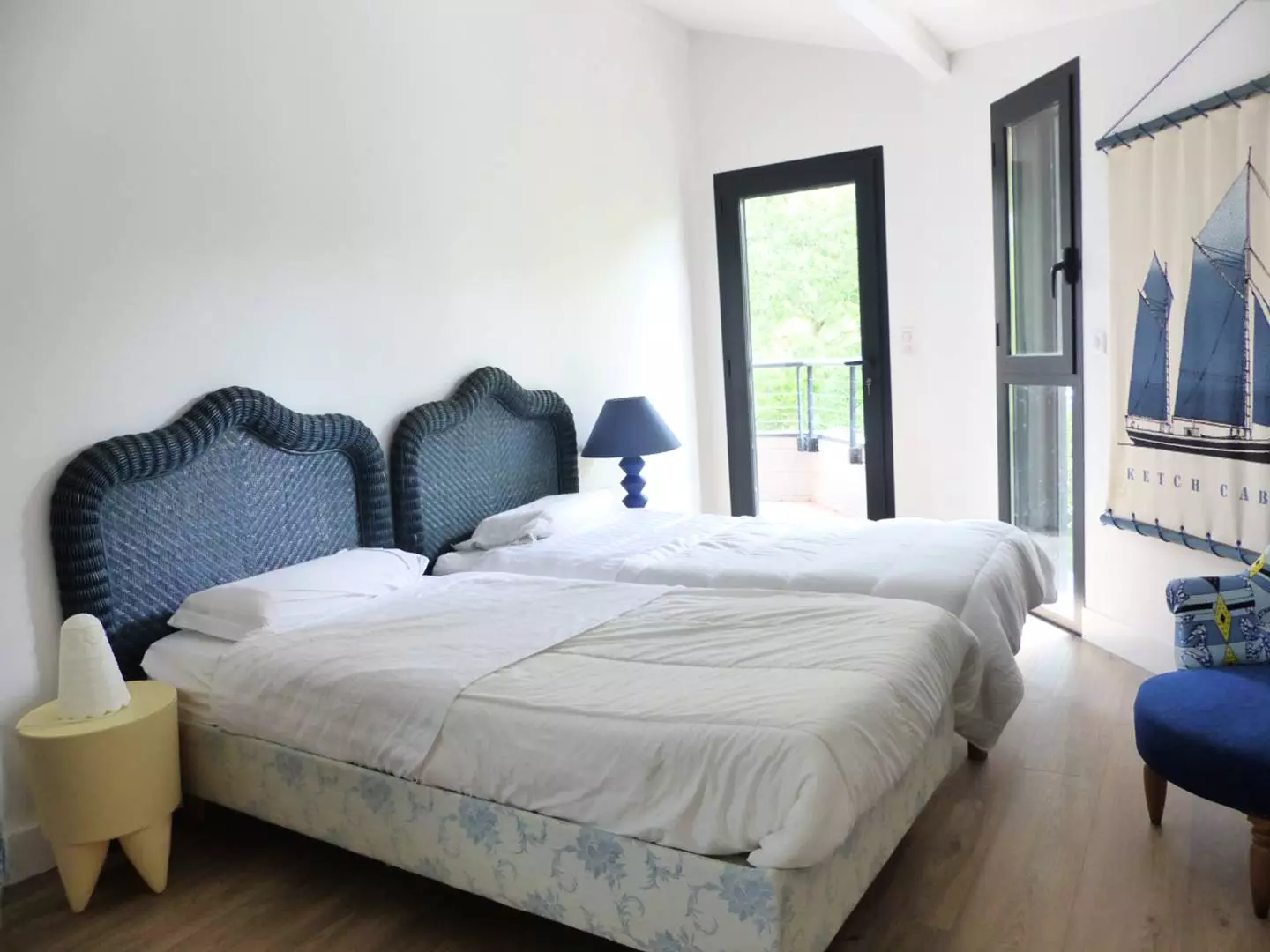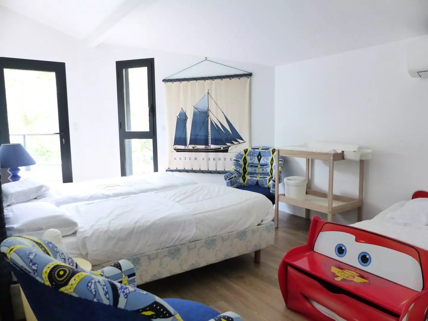 À l'étage, la villa dispose de trois chambres supplémentaires. La première chambre (n°4) est dotée d'un lit double (180 cm, deux lits de 90 cm rapprochés) avec un balcon est et un lit bébé à barreaux. La chambre n°5 offre un lit double (180 cm, deux lits de 90 cm rapprochés) et un petit lit enfant en forme de voiture Flash McQueen, ainsi qu'une table à langer. Une salle de douche avec vasque, douche à l'italienne, WC se trouve également à cet étage. La suite parentale (N°6) comprend un lit double (180 cm, deux lits de 90 cm rapprochés), un coin lecture, et une salle de bains privée avec double vasque, douche et WC séparés. Elle donne sur le jardin orienté sud et dispose d'un velux.