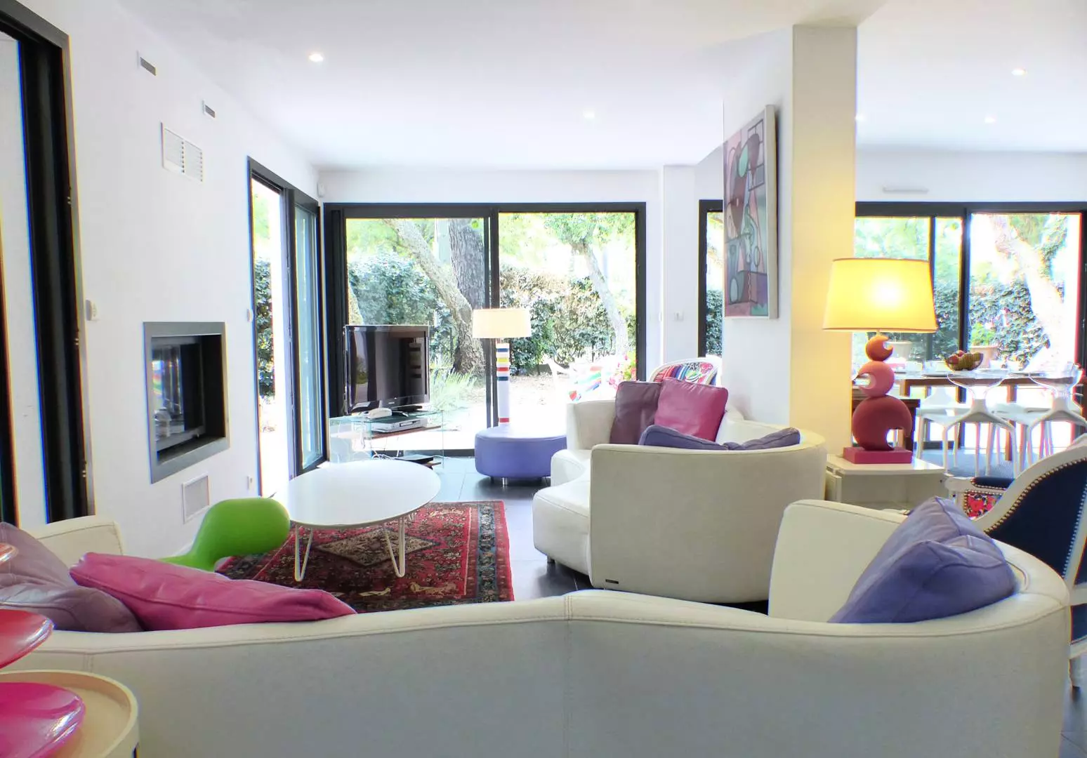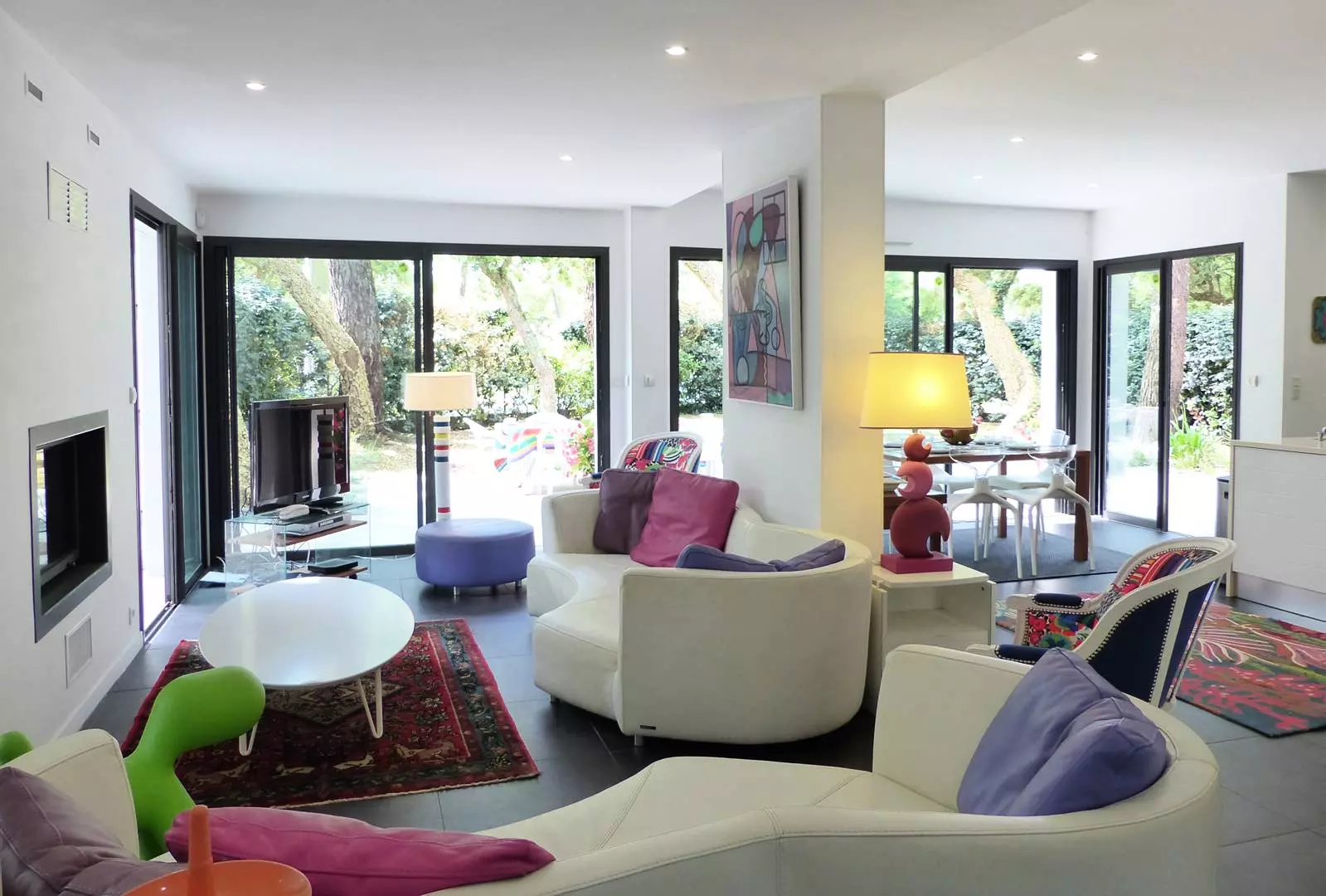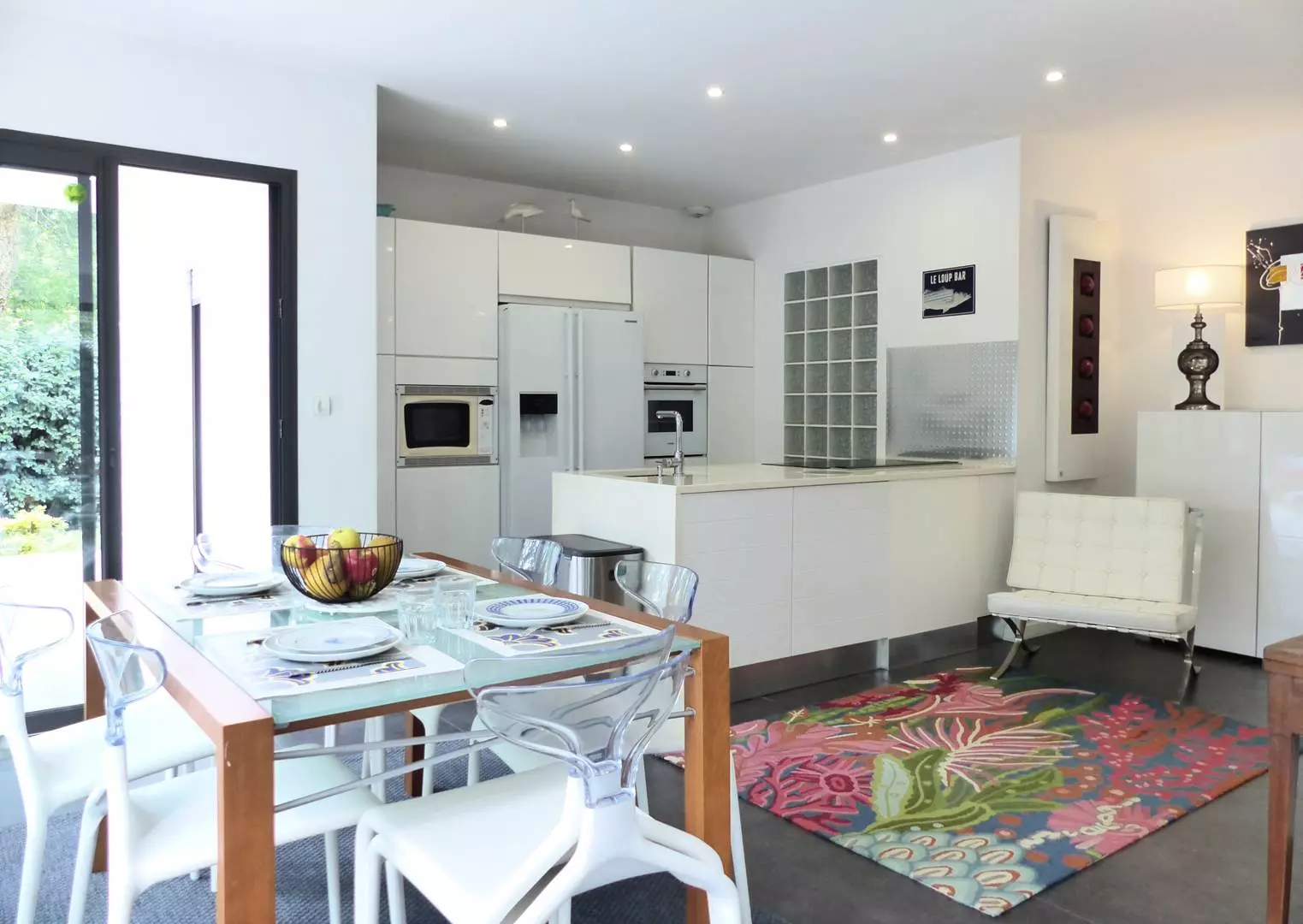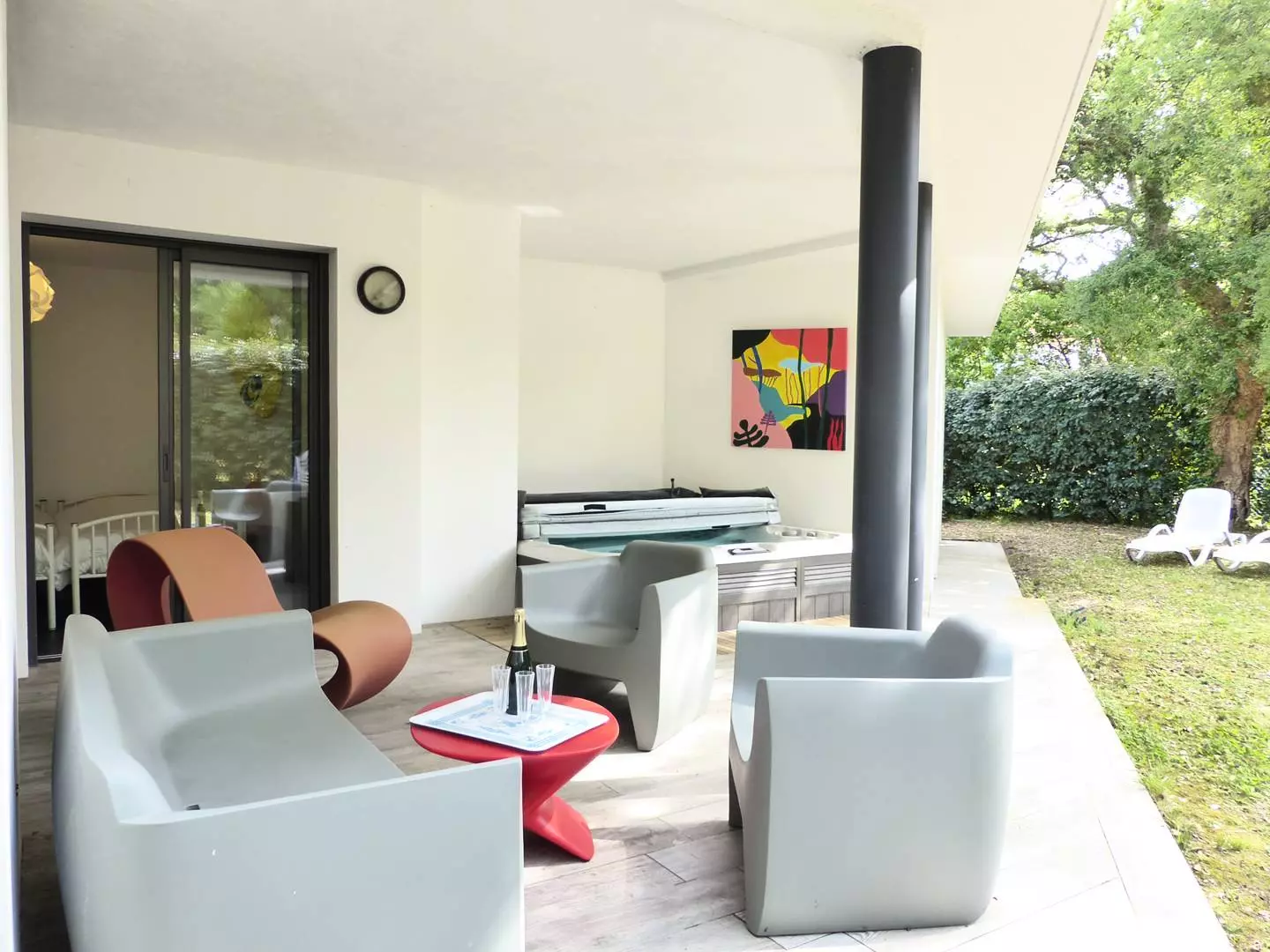 Le séjour et la cuisine forment un espace de vie ouvert et lumineux, s'ouvrant sur deux terrasses. La première, orientée sud, donne sur un jardin en sous-bois, tandis que la seconde, couverte, offre un accès direct au bains à remous (6 places). Un barbecue et une plancha sont également disponibles pour des soirées conviviales.