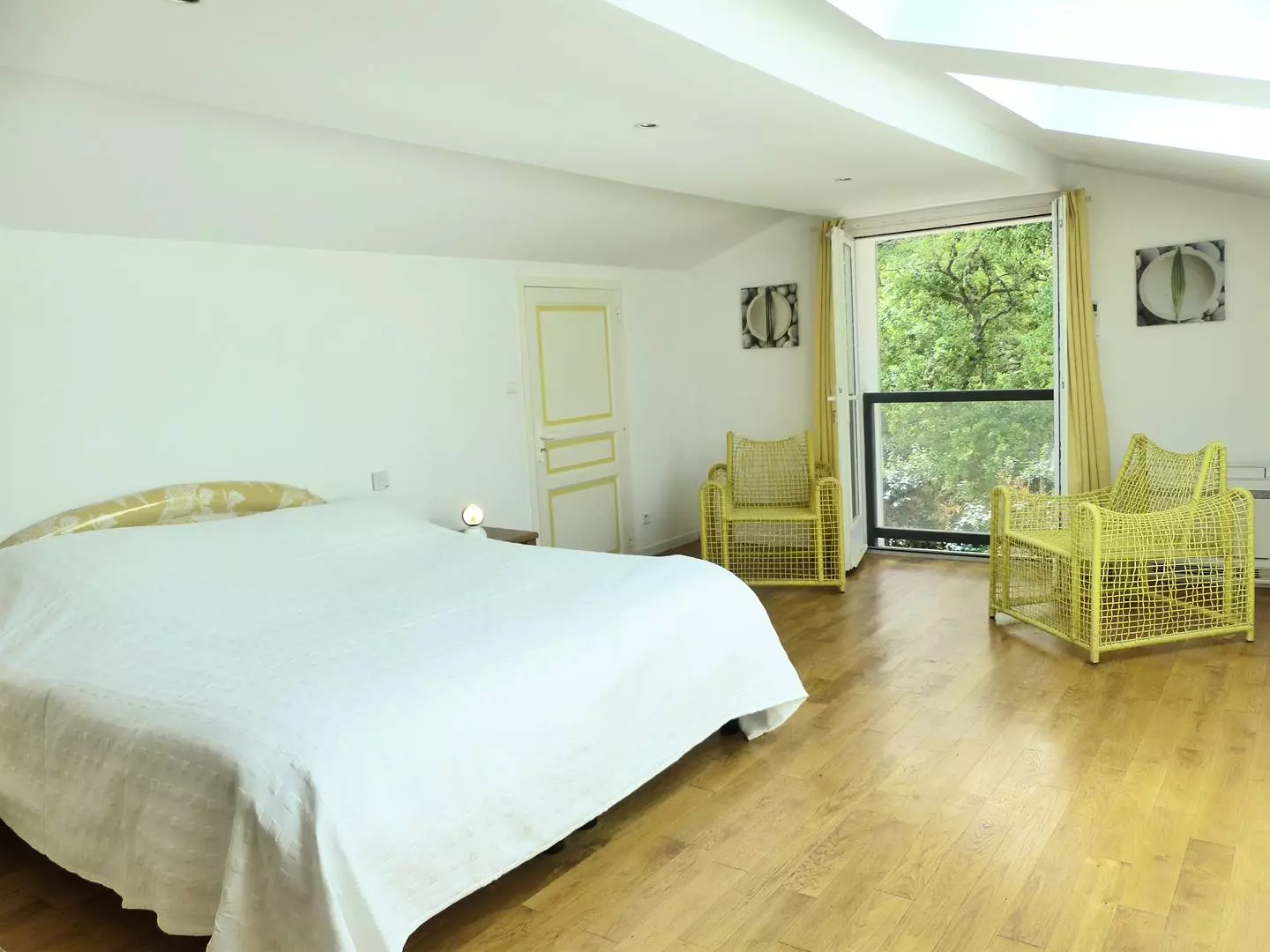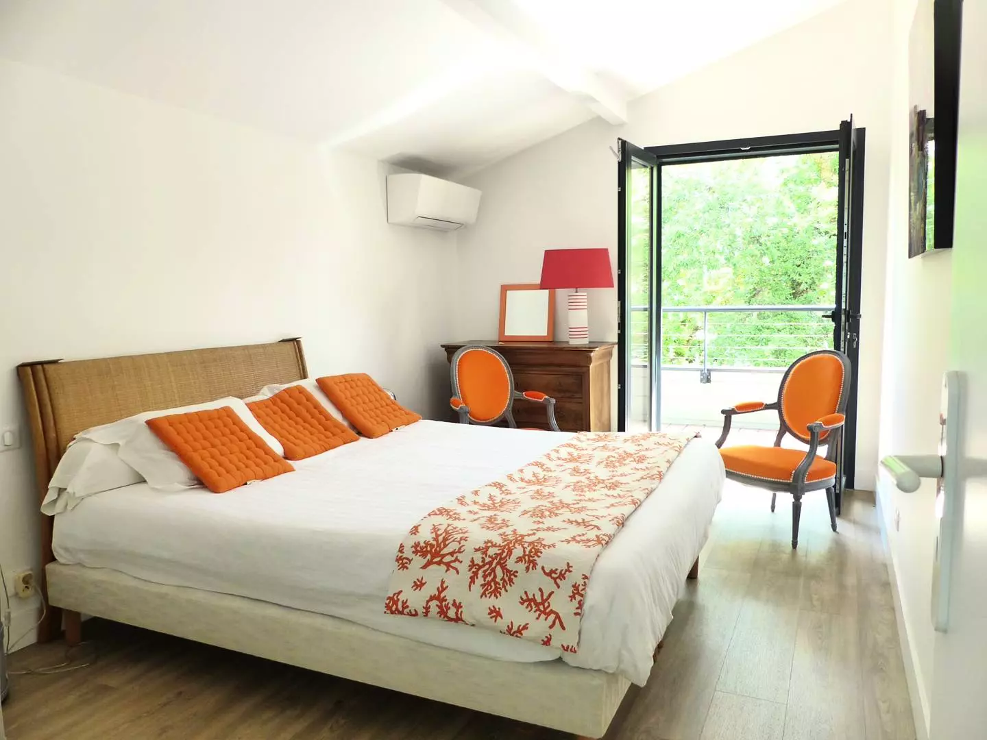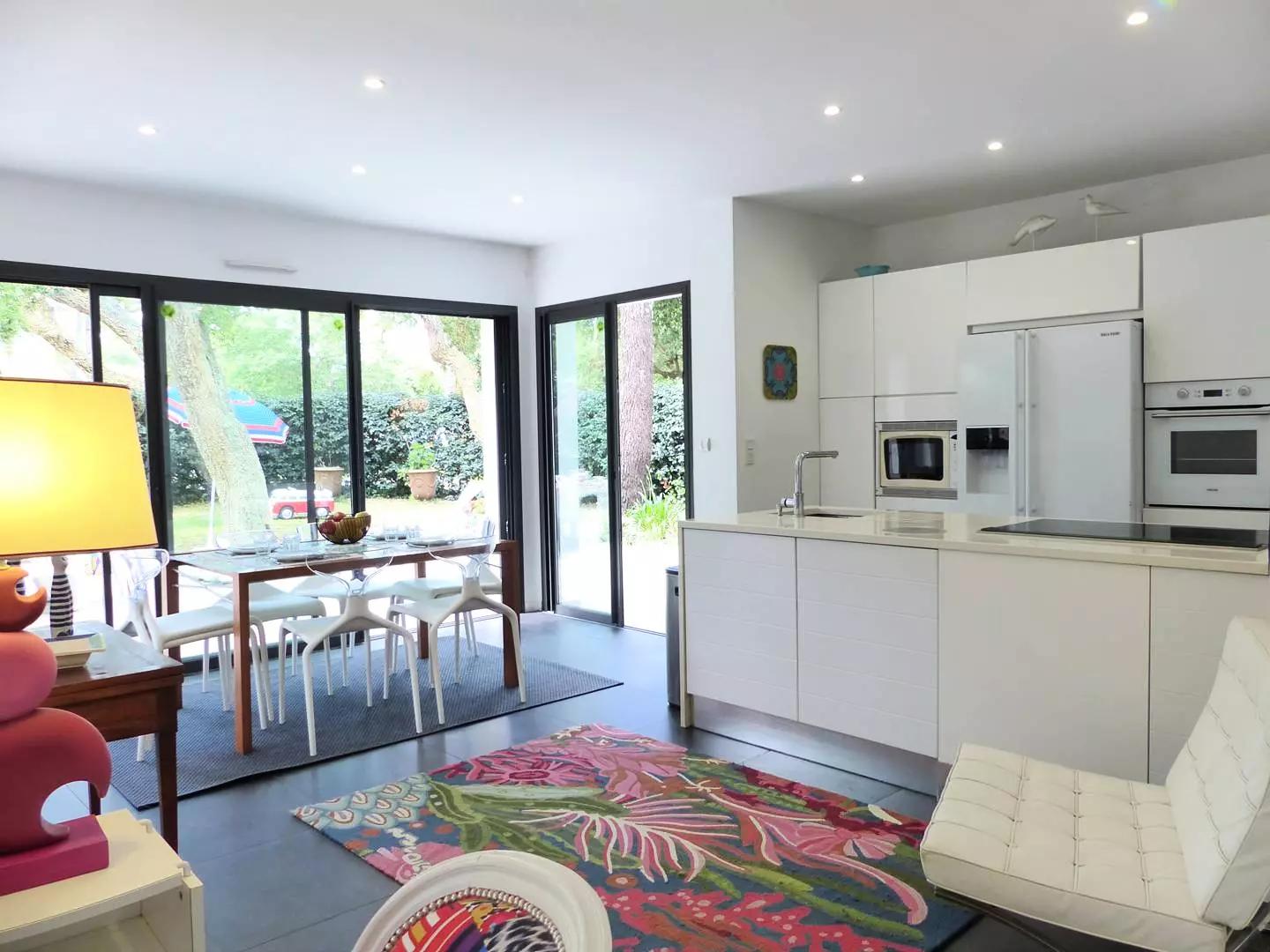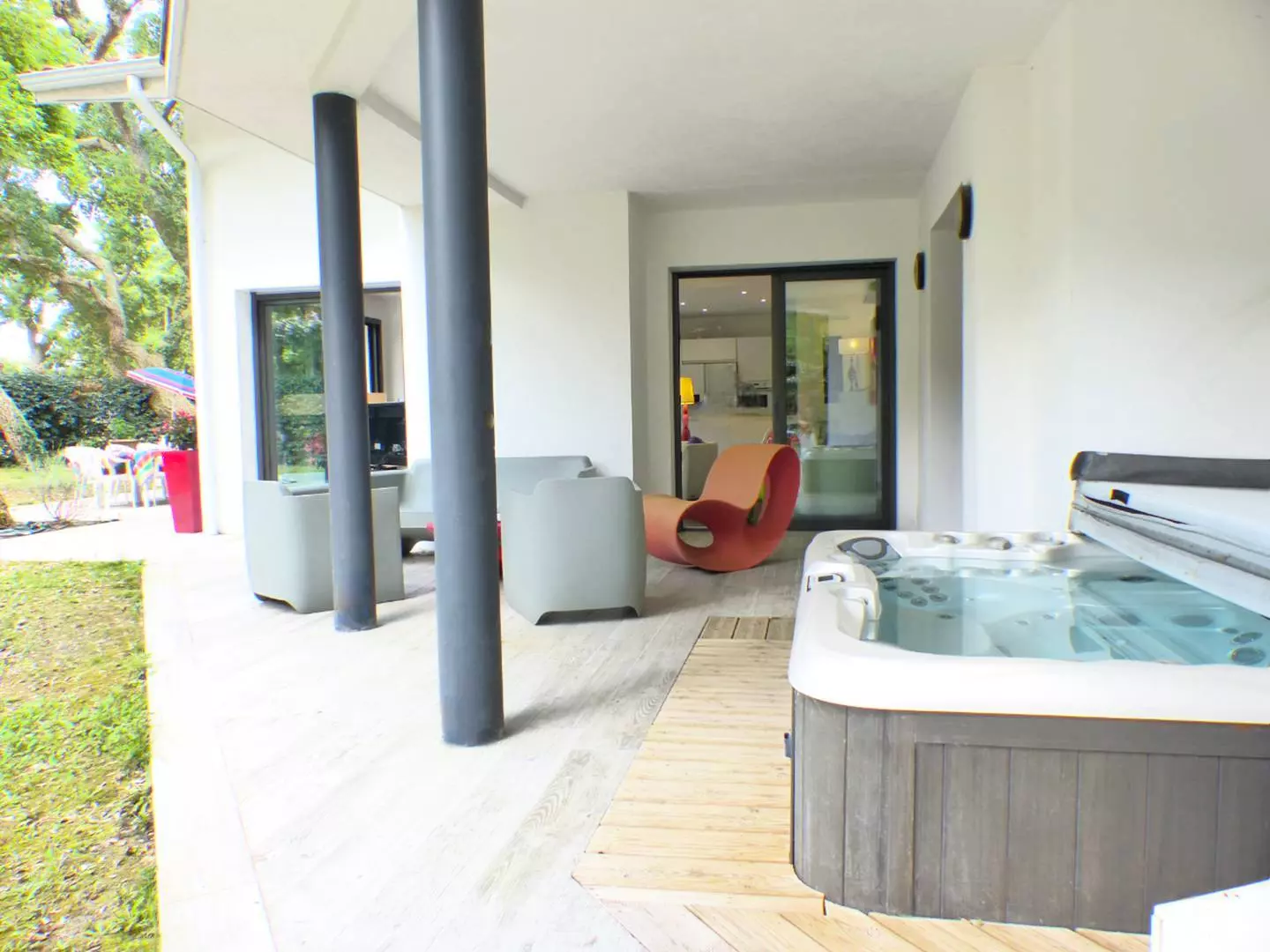 Le séjour et la cuisine forment un espace de vie ouvert et lumineux, s'ouvrant sur deux terrasses. La première, orientée sud, donne sur un jardin en sous-bois, tandis que la seconde, couverte, offre un accès direct au bains à remous (6 places). Un barbecue et une plancha sont également disponibles pour des soirées conviviales.
