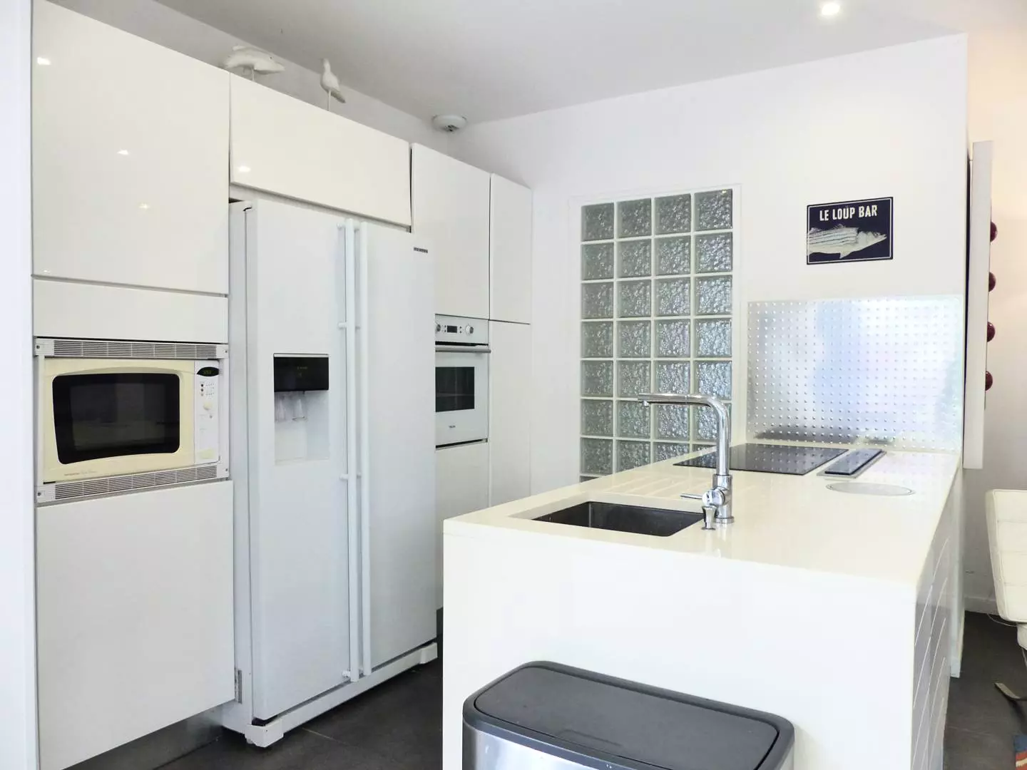 La cuisine moderne est entièrement équipée avec des plaques à induction, un réfrigérateur américain avec congélateur, et un lave-vaisselle.