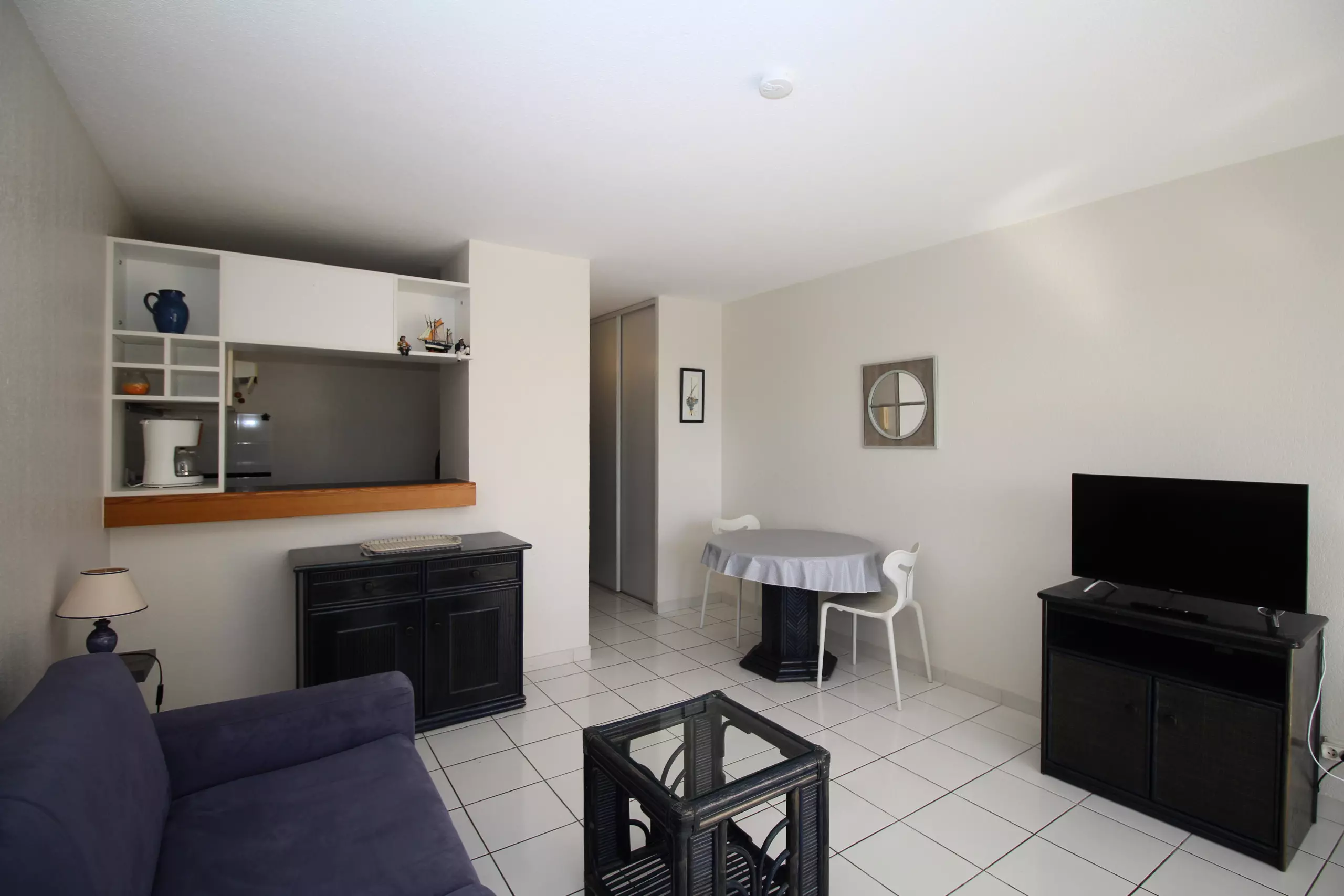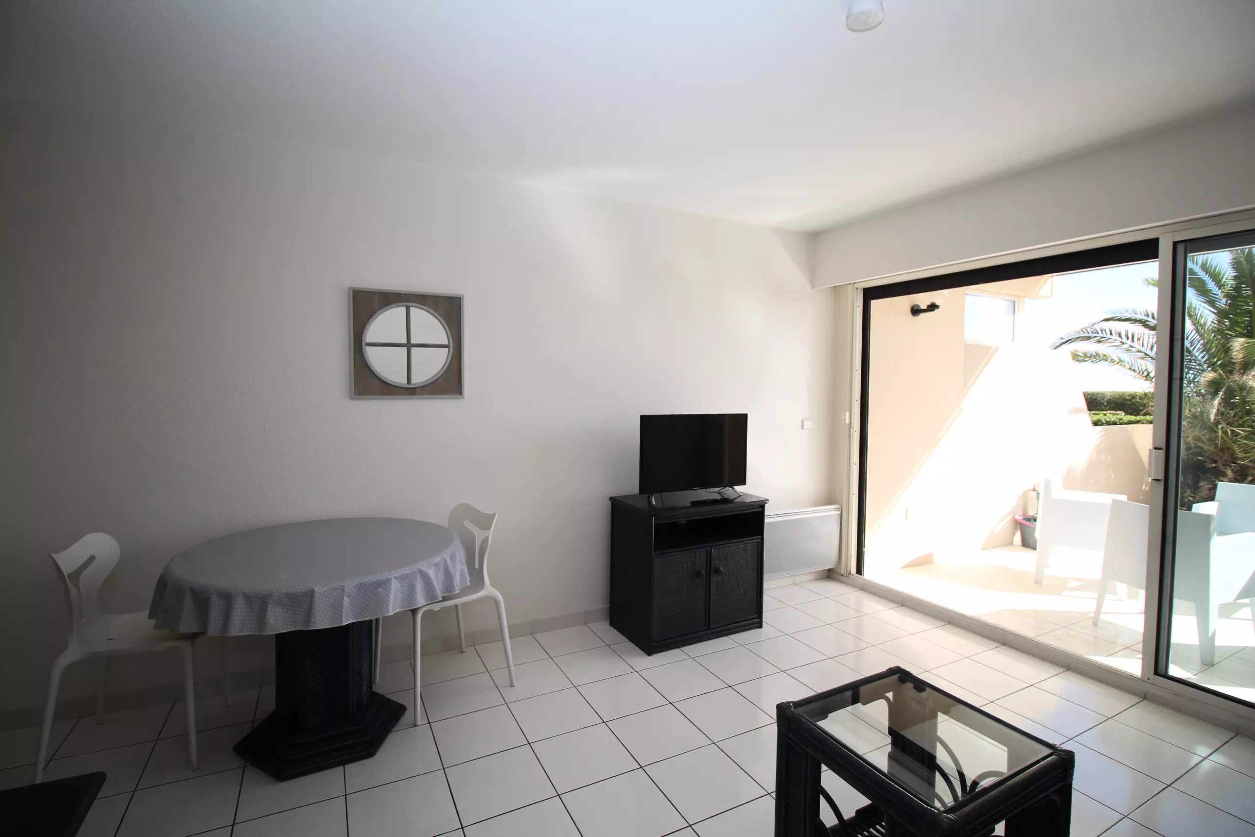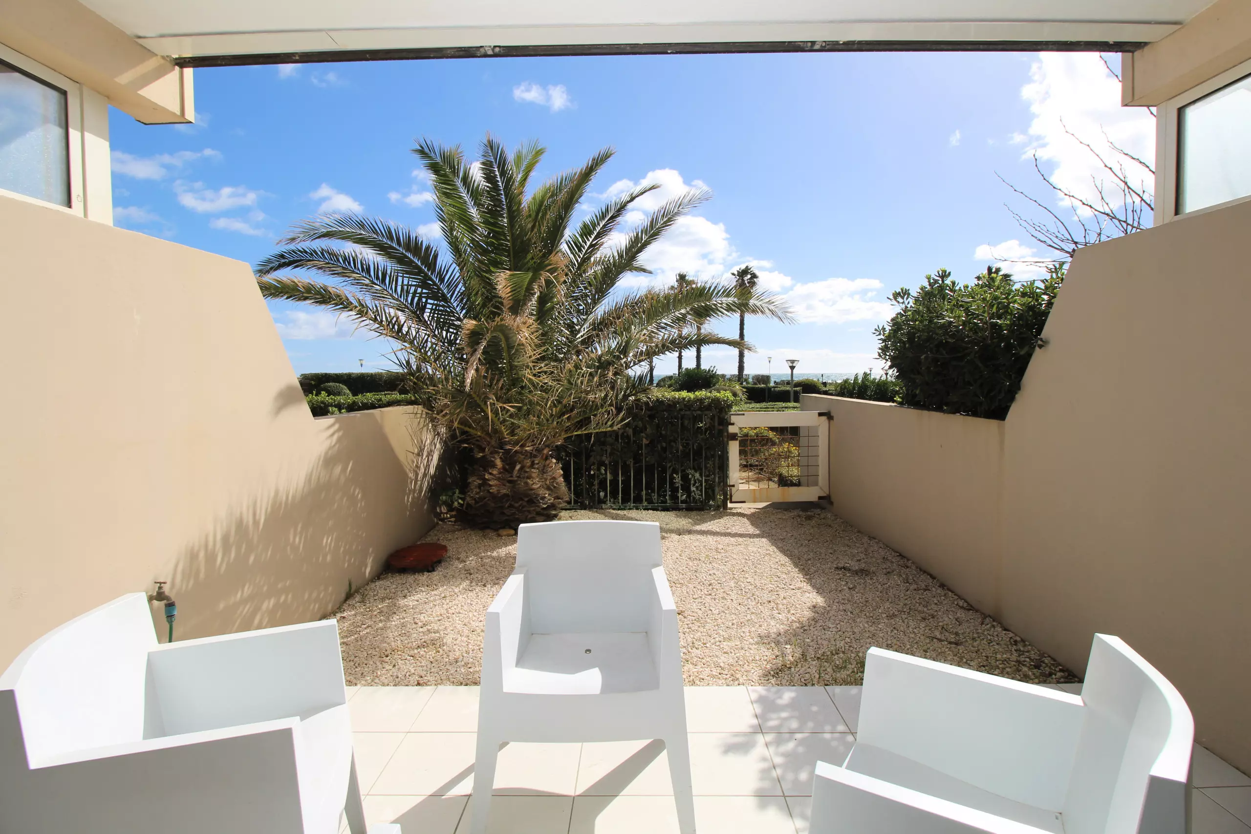 Ce studio de 26m² vous séduira par sa terrasse et son jardinet de 23 m² vue mer et jardins. Idéal pour prendre le petit déjeuner avec le lever du soleil ou les repas à l'ombre.