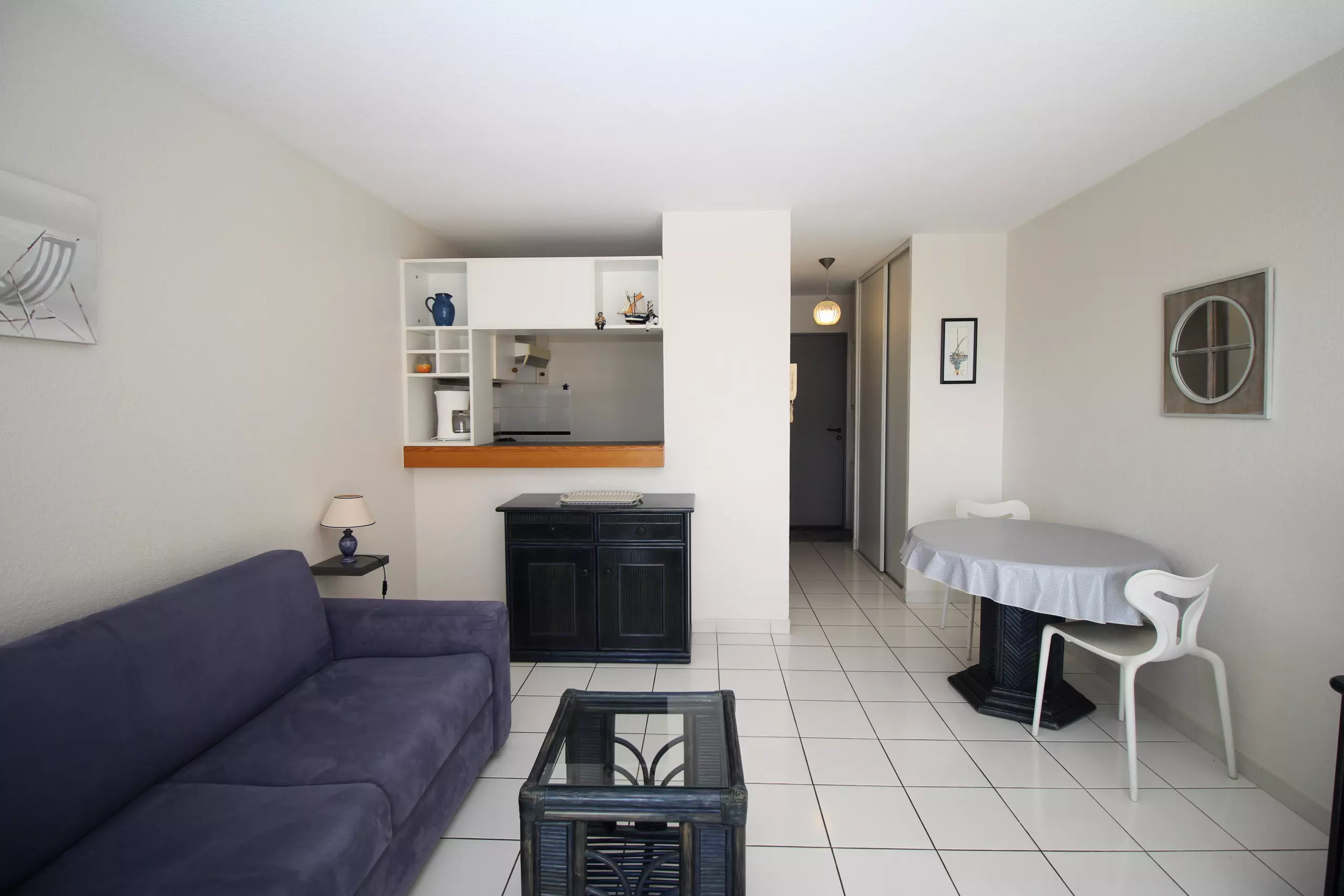 Il se compose d'une entrée desservant une salle de bain avec baignoire et WC ainsi qu'une pièce de vie avec coin cuisiné aménagée et équipée. Le tout donnant sur un jardinet clos avec vue sur la mer et sur les jardins de la résidence.