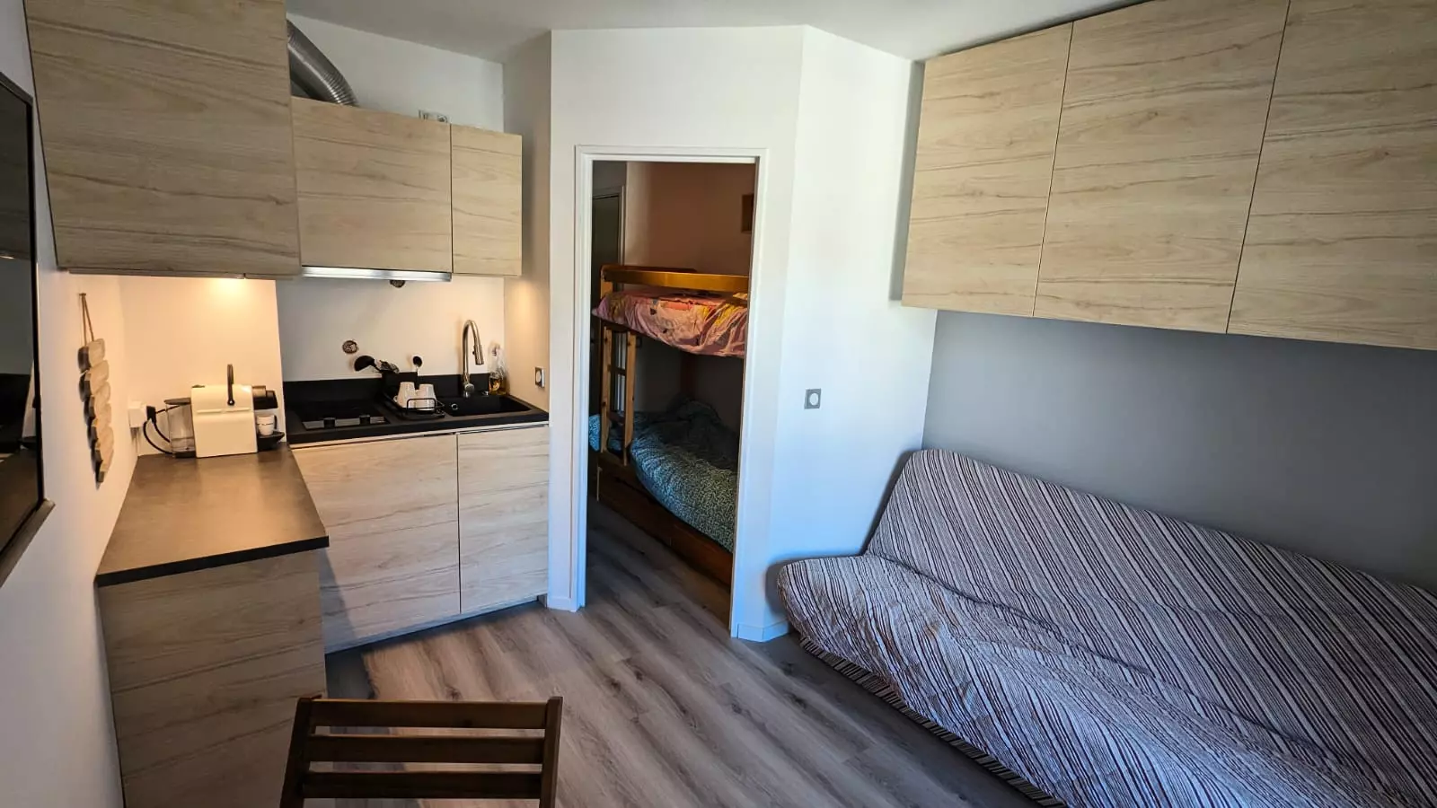Petit studio de 16m² pouvant accueillir jusqu'à 4 personnes, situé au 5ème étage avec ascenseur, se compose de :