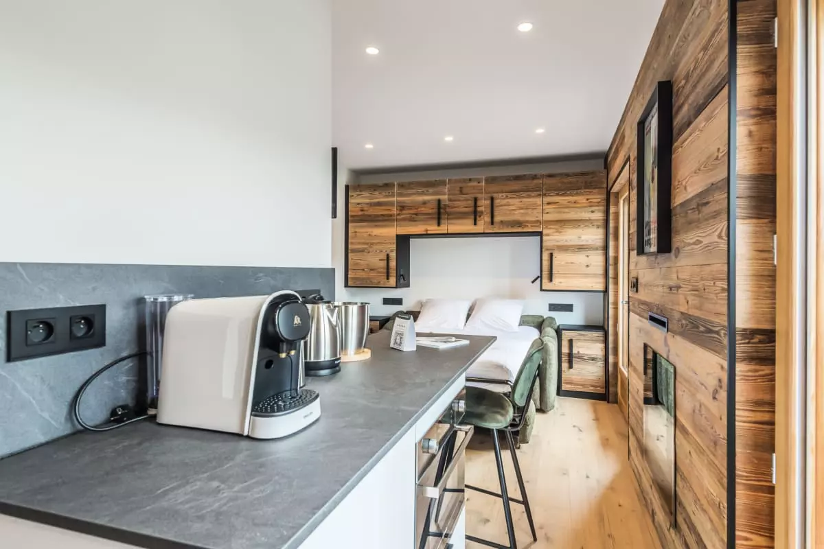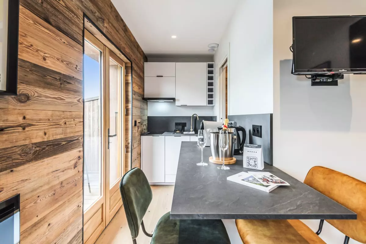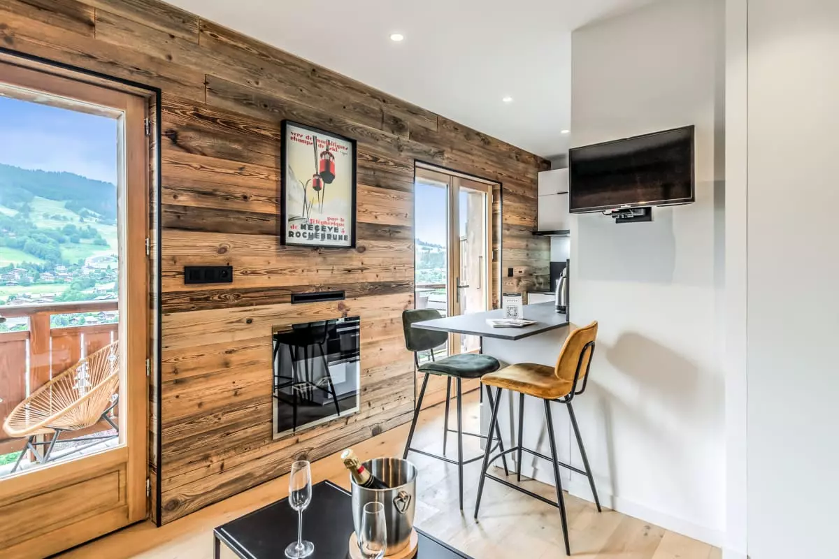 Cet appartement chaleureux, bénéficiant d'une vue superbe sur le village de Megève et sur le Jaillet, se trouve au 2e étage d'une résidence (sans ascenseur). Son espace de vie de 20 m² propose :