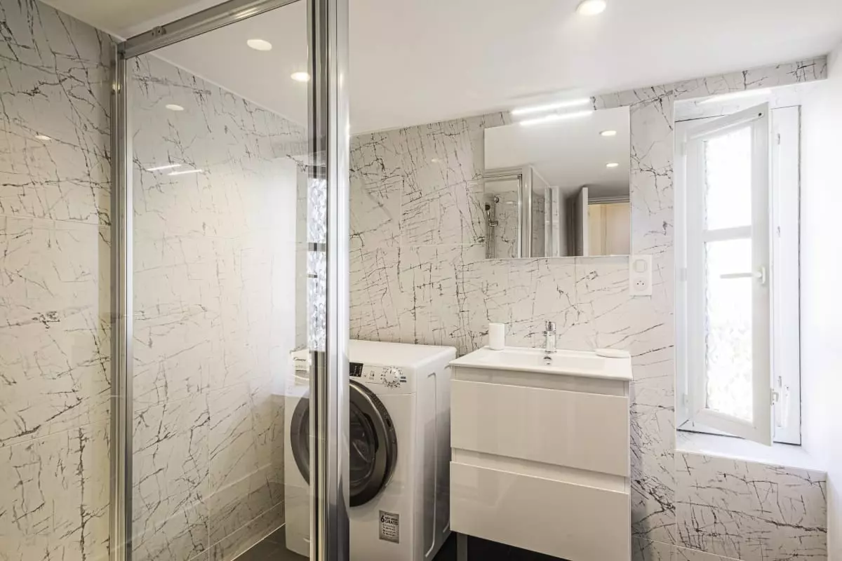 Situé au rez-de-chaussée d'un magnifique immeuble avec jardins et parking, ce beau studio entièrement rénové de 35 m² comprend :