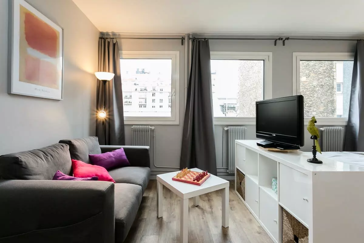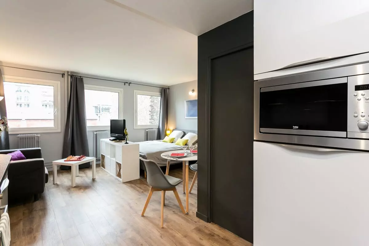 Ce studio à la décoration soignée en plein centre de Paris est situé au 3eme étage avec ascenseur d'un immeuble calme avec jardin. Il se compose de :