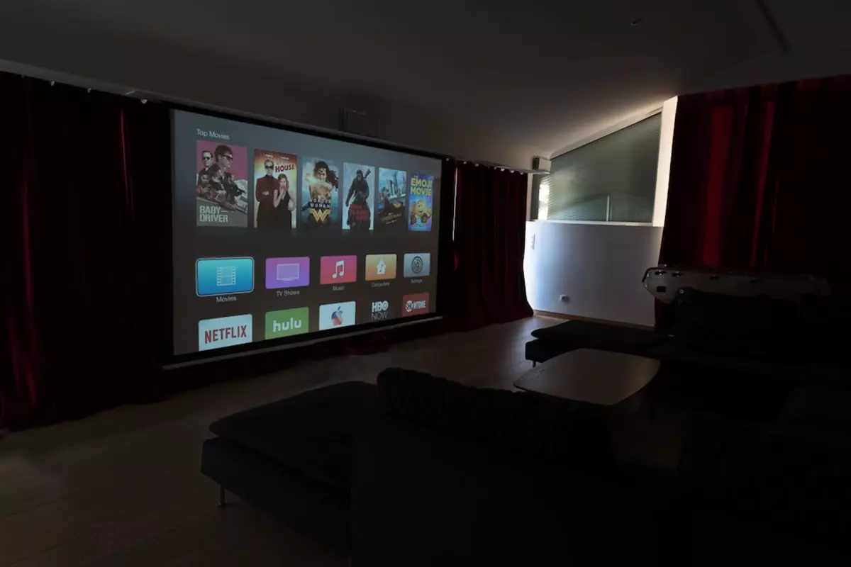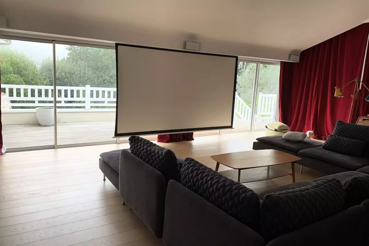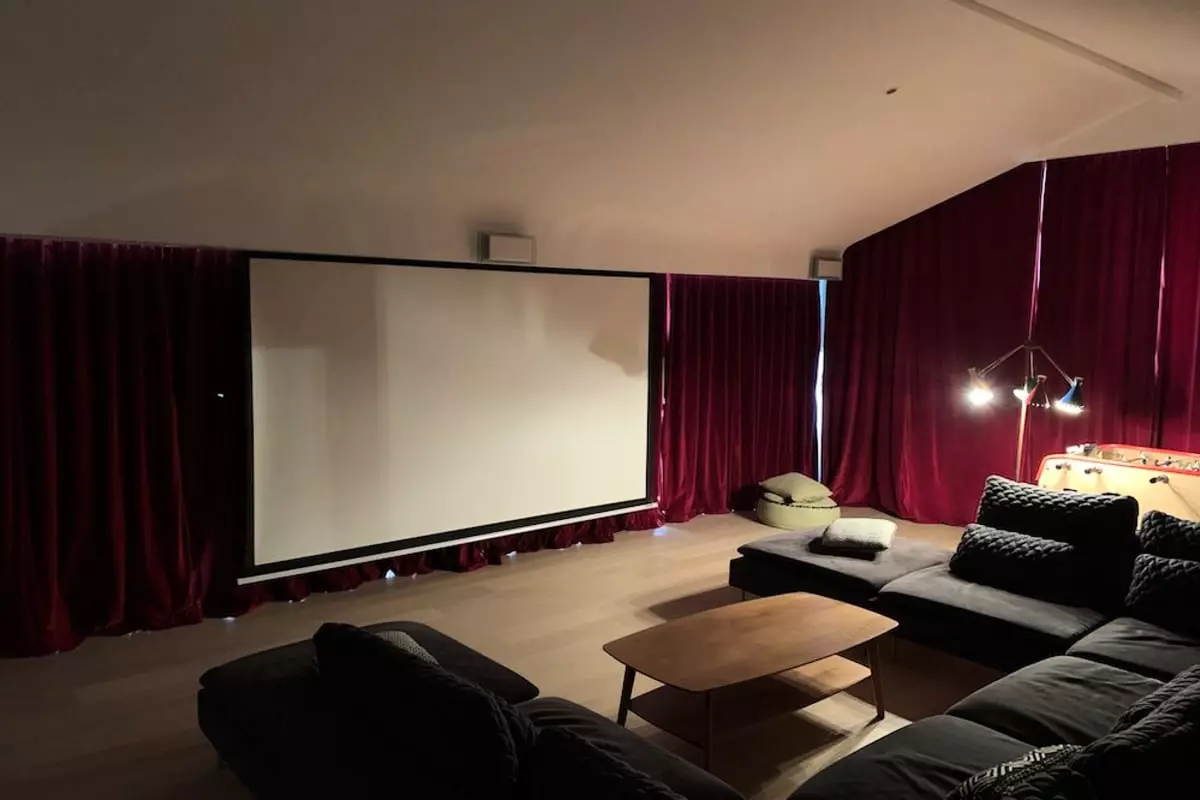 Les grandes baies vitrées du rez-de-chaussée, comme celles de l'étage supérieur, permettent à la lumière de pénétrer librement dans le salon spacieux, la salle de cinéma maison et les chambres. Il y a quatre chambres pouvant accueillir jusqu'à 10 personnes avec des enfants. Deux chambres sont ensuite, plus deux salles de bains séparées. Il y a plus qu'assez d'espace pour que toute la famille ou deux familles distinctes se sentent à l'aise! La grande salle de cinéma attenante peut également être utilisée comme dortoir pour enfants et est idéale et conviviale pour les familles.