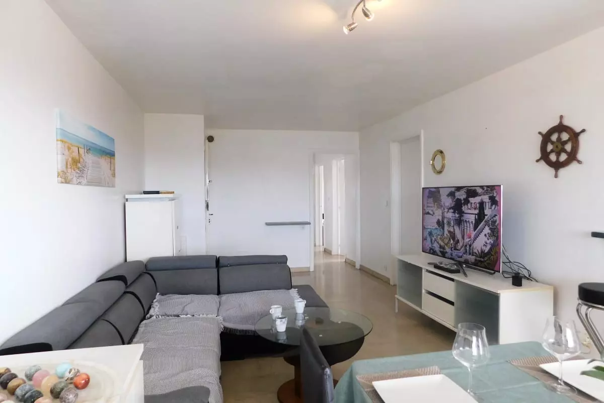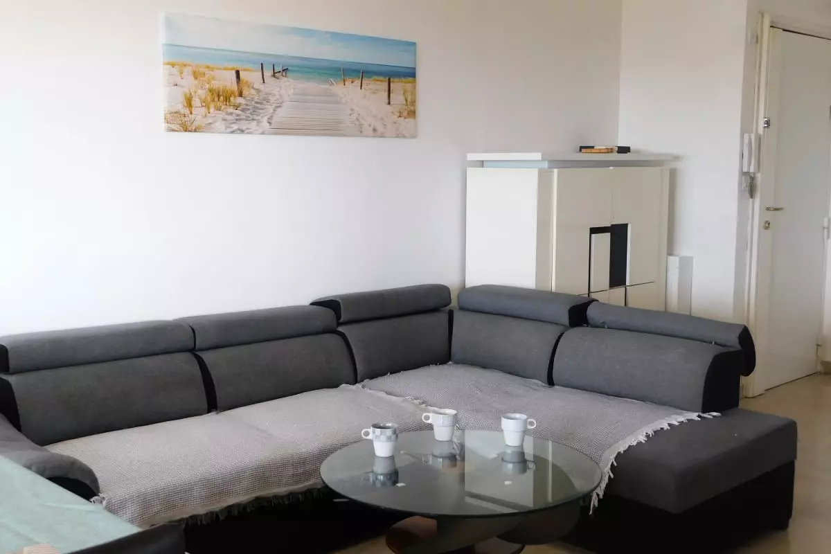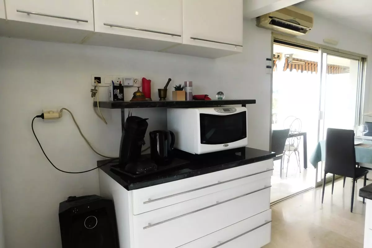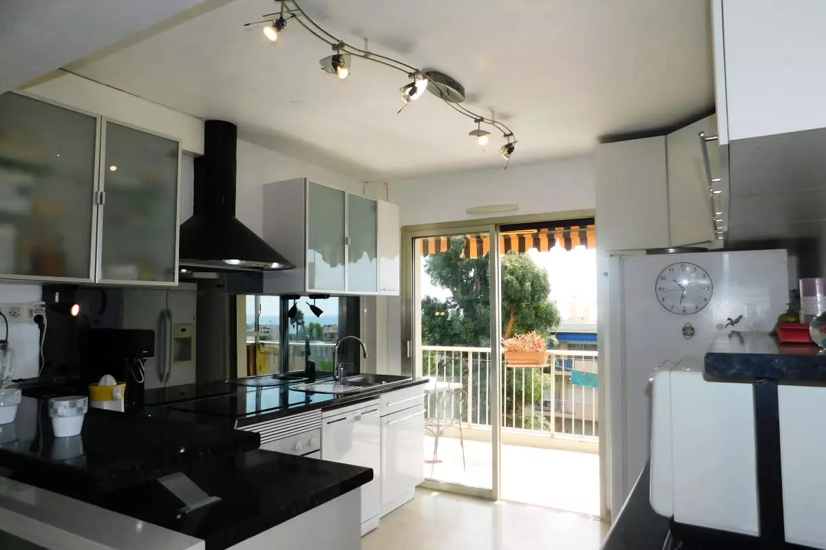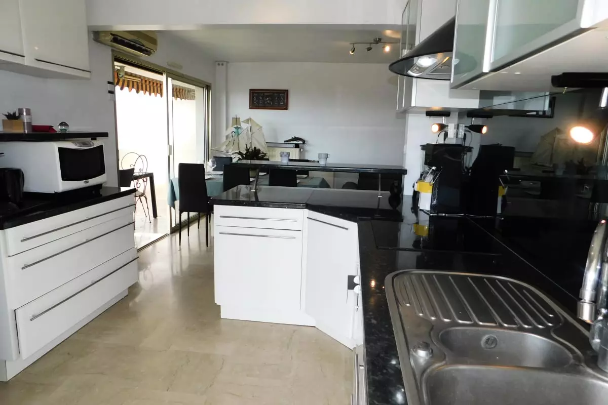 Le salon est doté d'une cuisine ouverte équipée, où vous pourrez préparer de délicieux repas en famille ou entre amis. Profitez des deux balcons offrant une vue imprenable sur la mer Méditerranée. L'un des balcons est idéal pour se détendre en sirotant un café, tandis que l'autre est aménagé pour les repas en plein air, où vous pourrez déguster vos mets tout en admirant le panorama.