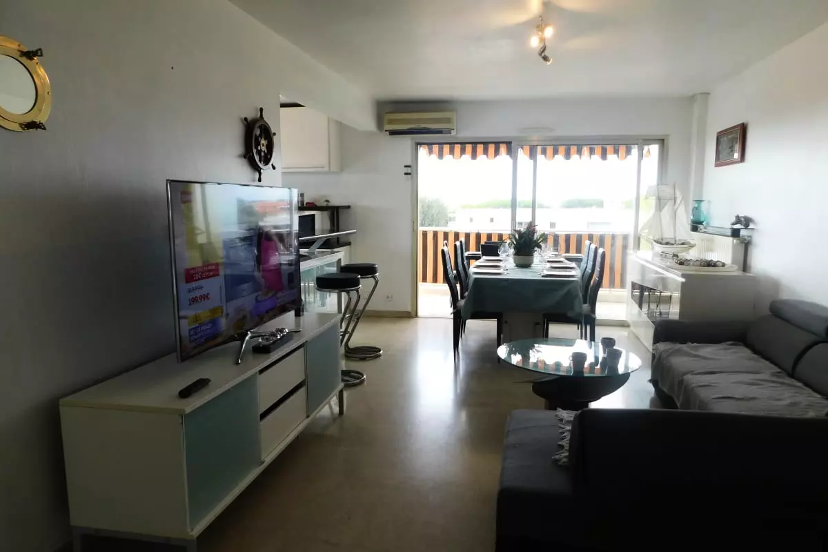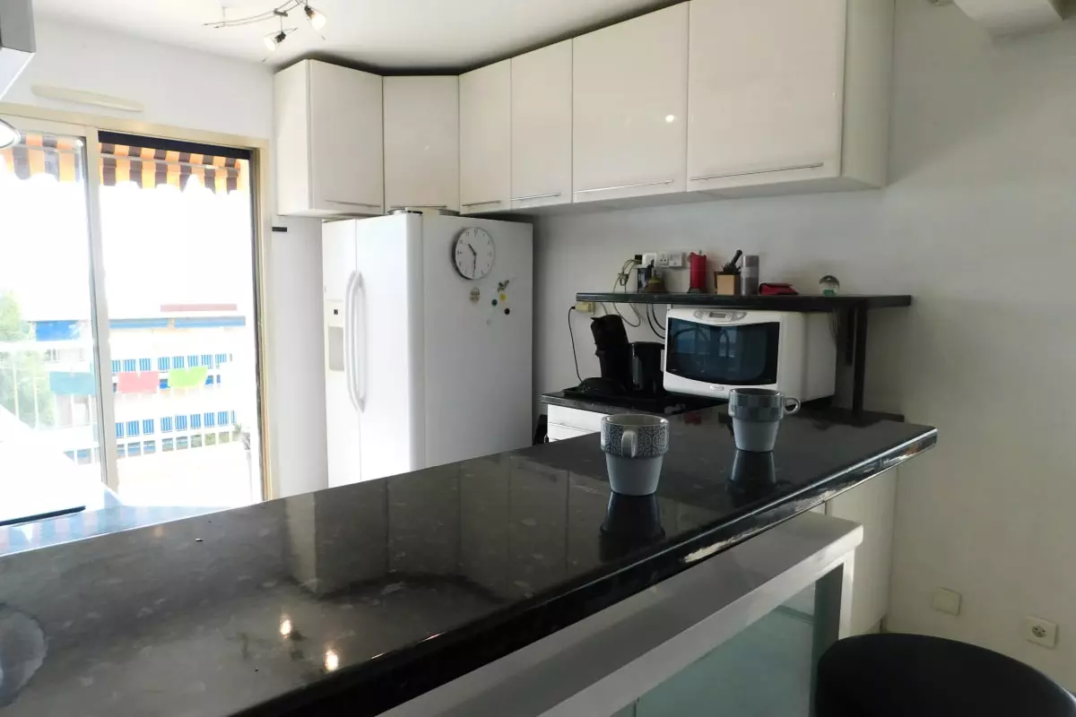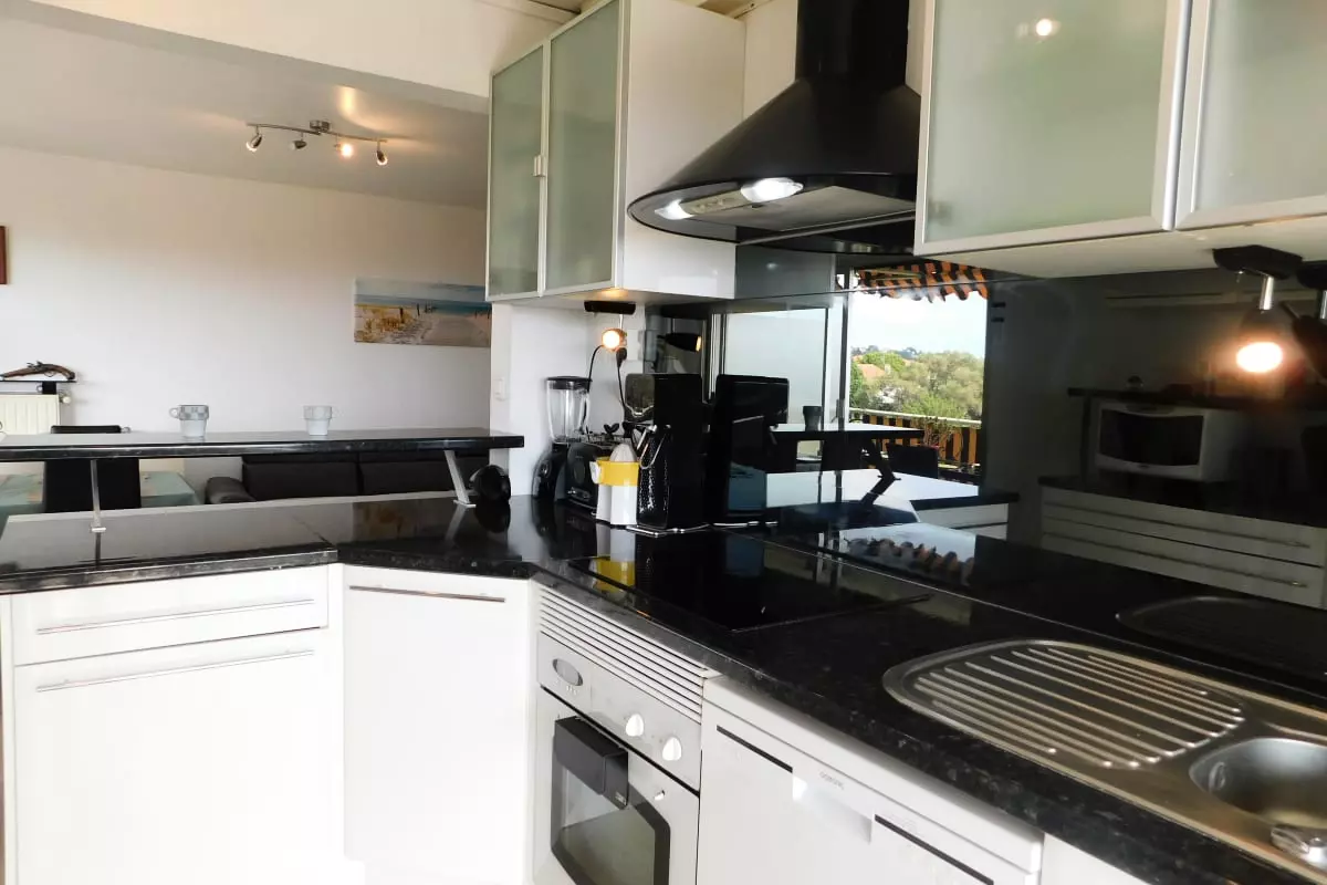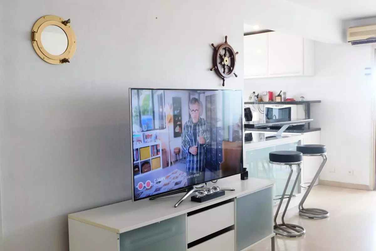 Le salon est doté d'une cuisine ouverte équipée, où vous pourrez préparer de délicieux repas en famille ou entre amis. Profitez des deux balcons offrant une vue imprenable sur la mer Méditerranée. L'un des balcons est idéal pour se détendre en sirotant un café, tandis que l'autre est aménagé pour les repas en plein air, où vous pourrez déguster vos mets tout en admirant le panorama.