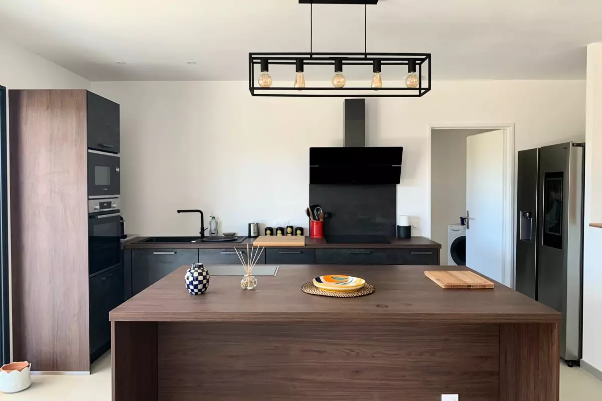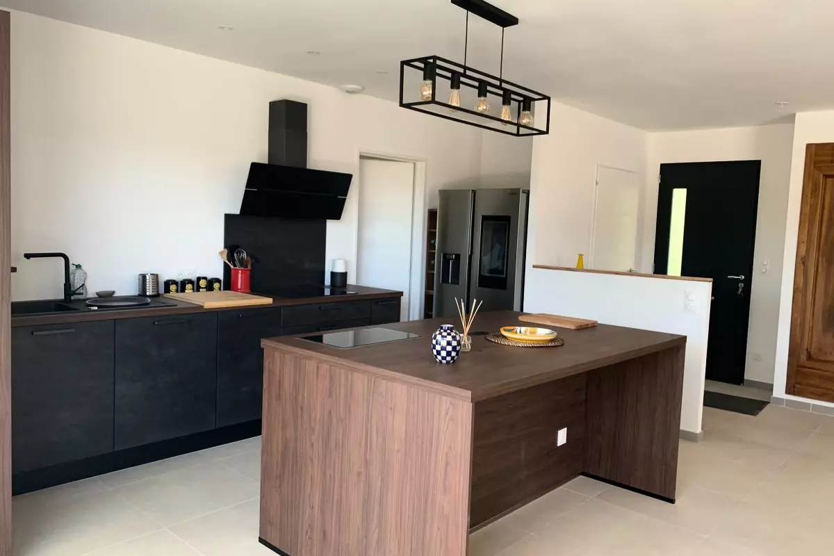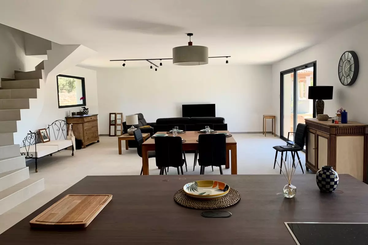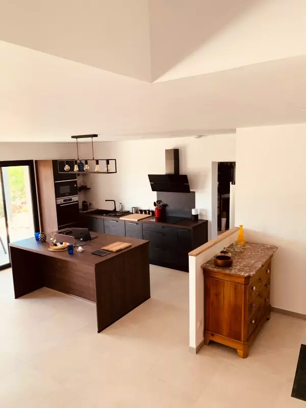 Au rez-de-chaussée, cuisine ouverte toute équipée qui donne sur un grand salon confortable, grandes baies vitrées donnant accès à la terrasse avec pergola bioclimatique ainsi que sur le jardin.