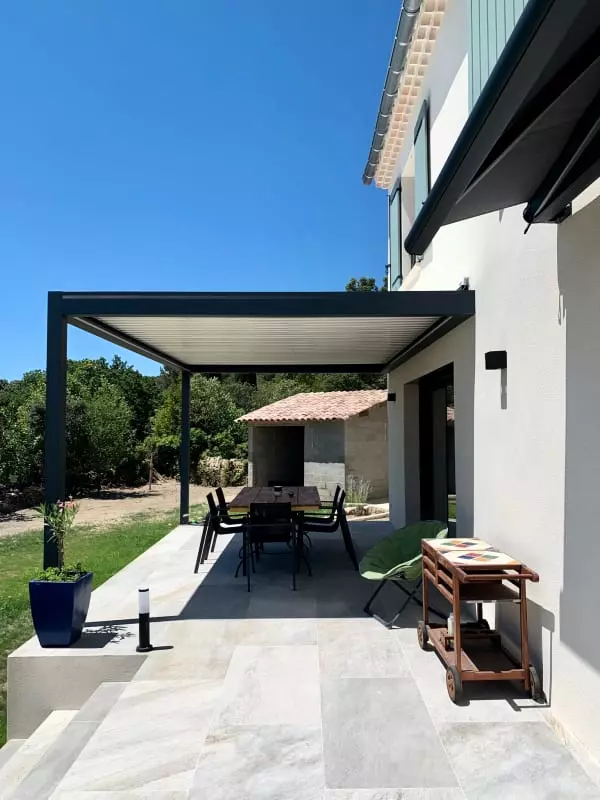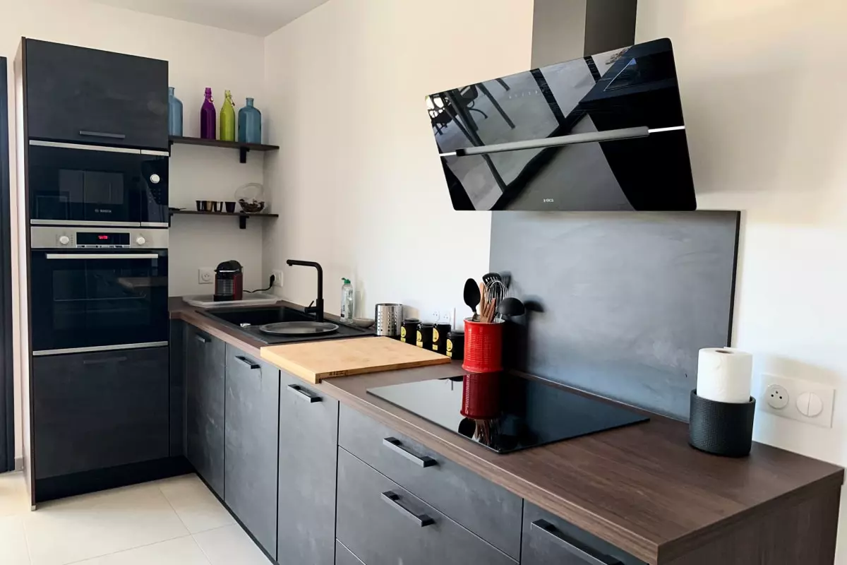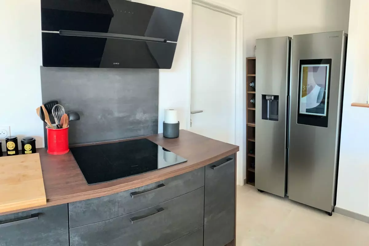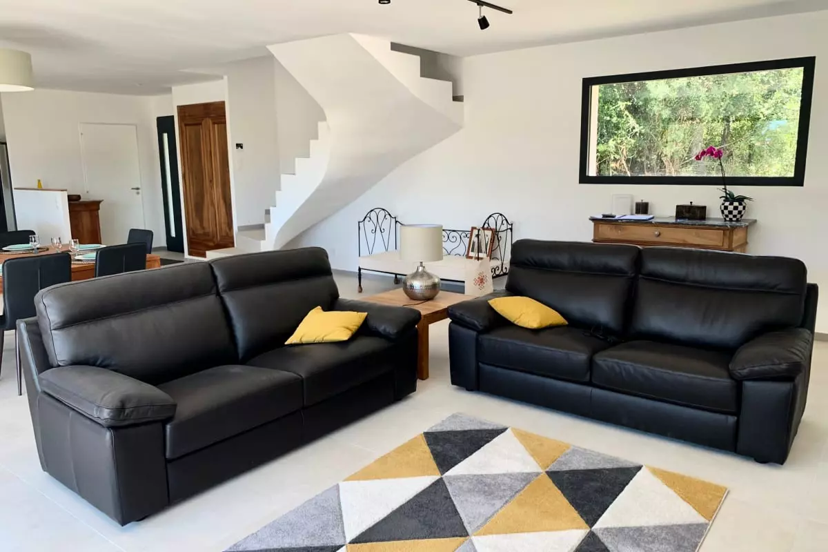 Au rez-de-chaussée, cuisine ouverte toute équipée qui donne sur un grand salon confortable, grandes baies vitrées donnant accès à la terrasse avec pergola bioclimatique ainsi que sur le jardin.