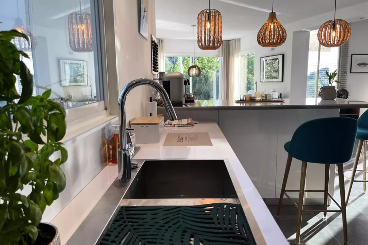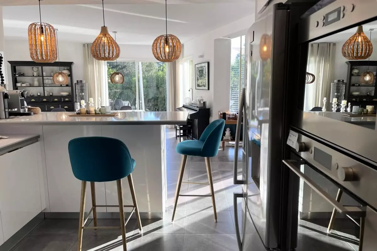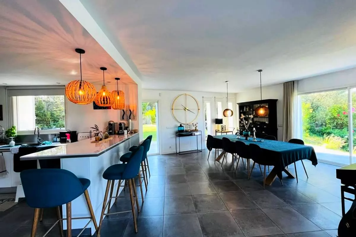 * Très Belle pièce à vivre ouverte sur l'extérieur avec cuisine parfaitement équipée et aménagée. Salon confortable et salle à manger lumineuse