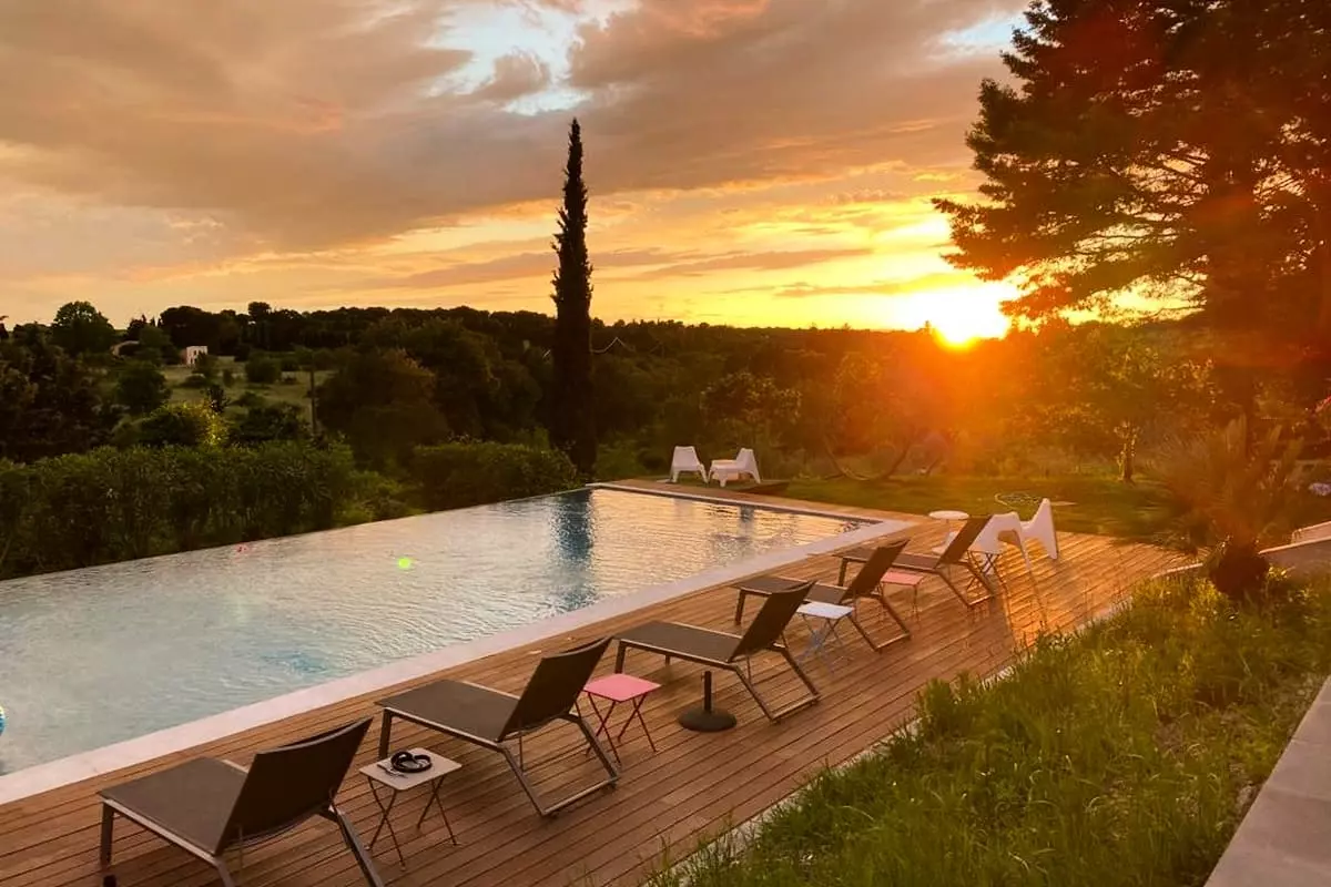 * Piscine 13x6 avec sa plage en bois, ses bains de soleil avec parasols