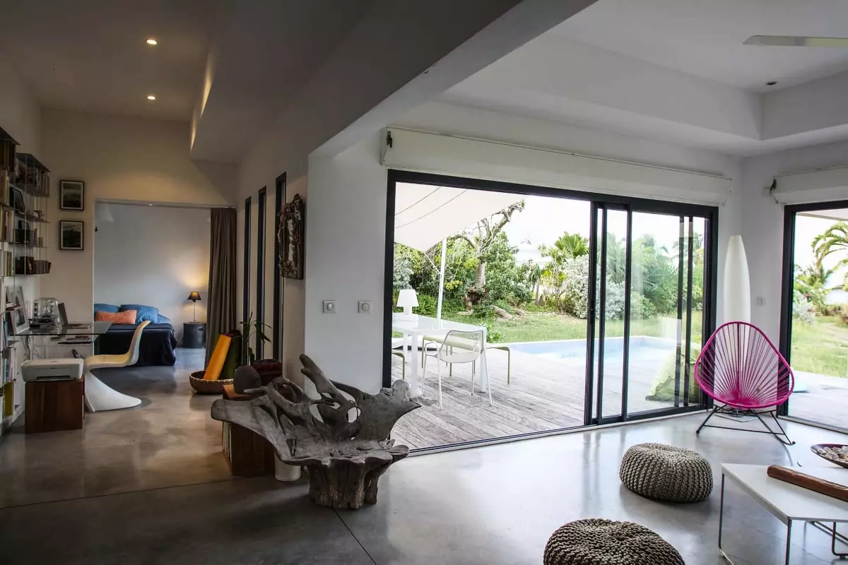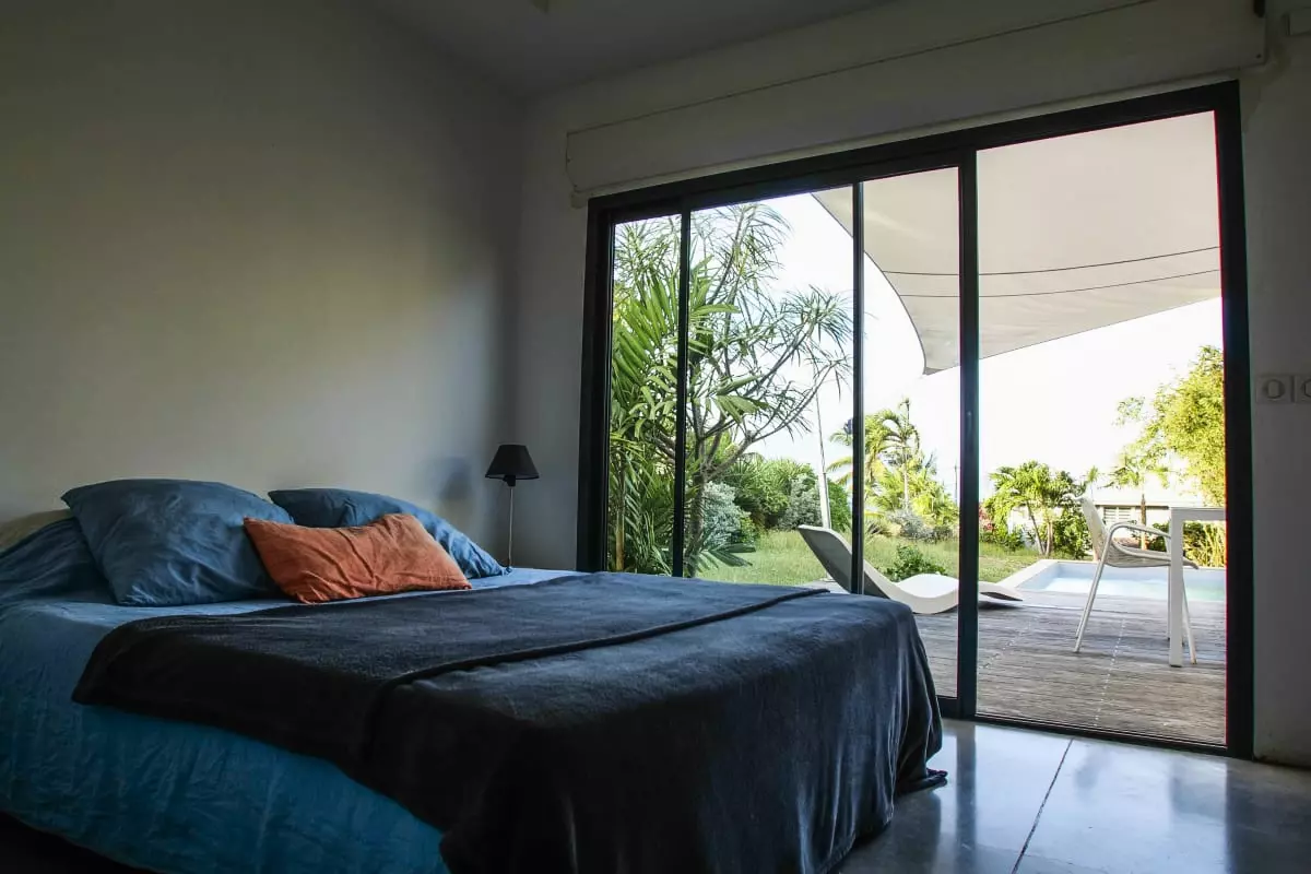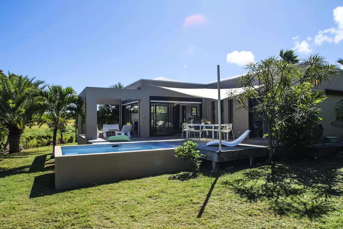 Une composition harmonieuse d'une villa contemporaine et d'un joli bungalow en bois. Piscine privée et beau jardin. Située à 5 minutes des plages et des commodités.