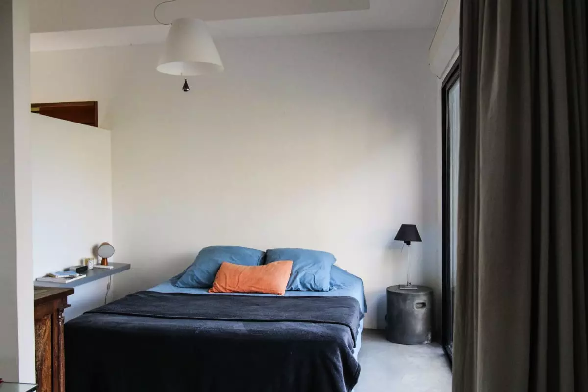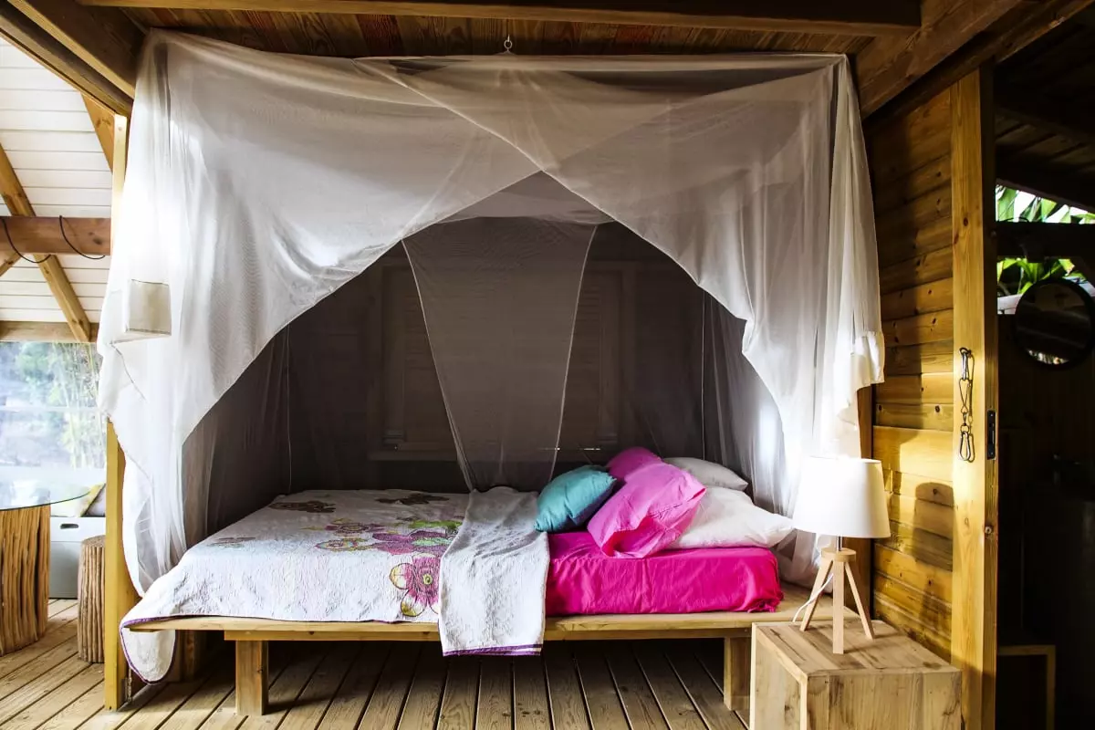L'intérieur de la villa présente une chambre climatisée avec un lit 160cm et une salle de bain attenante.