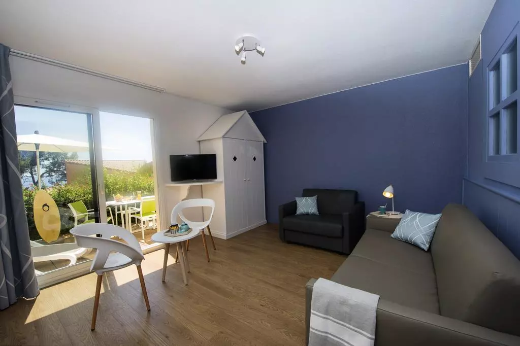 Séjour avec 2 lits simples et canapé convertible simple.