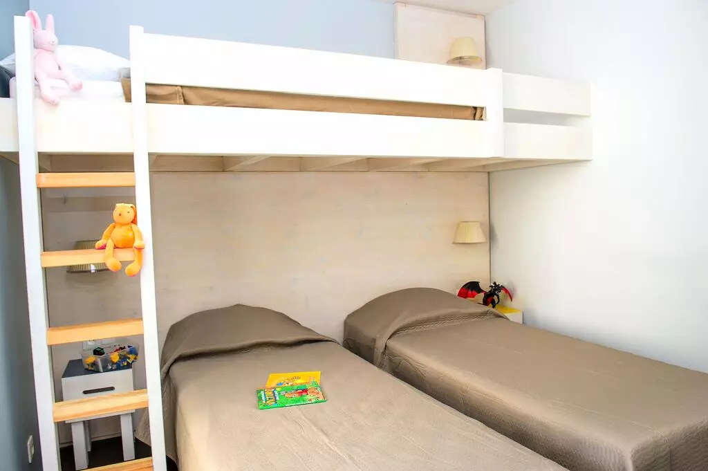 Chambre avec 2 lits simples et lit superposé.