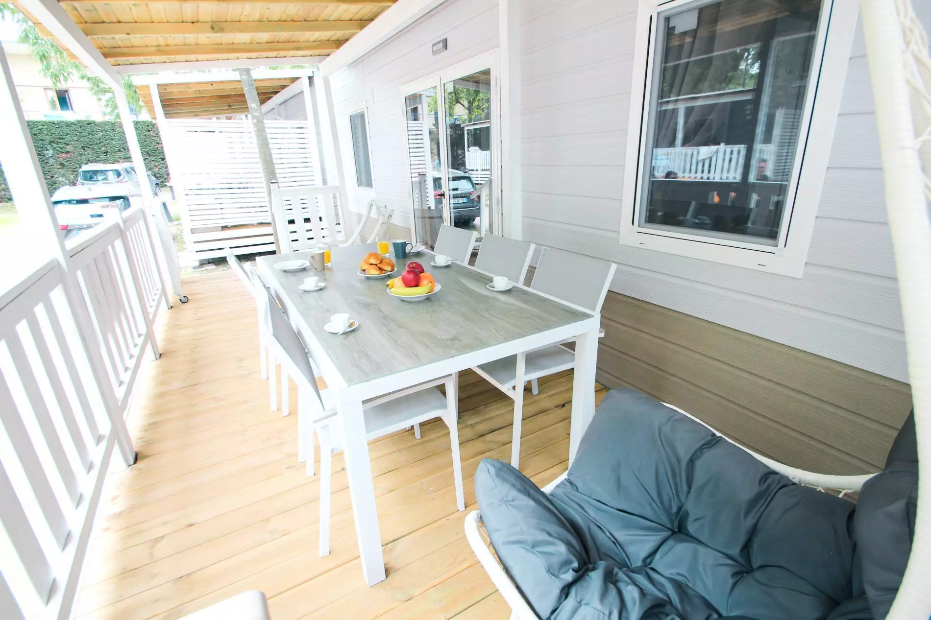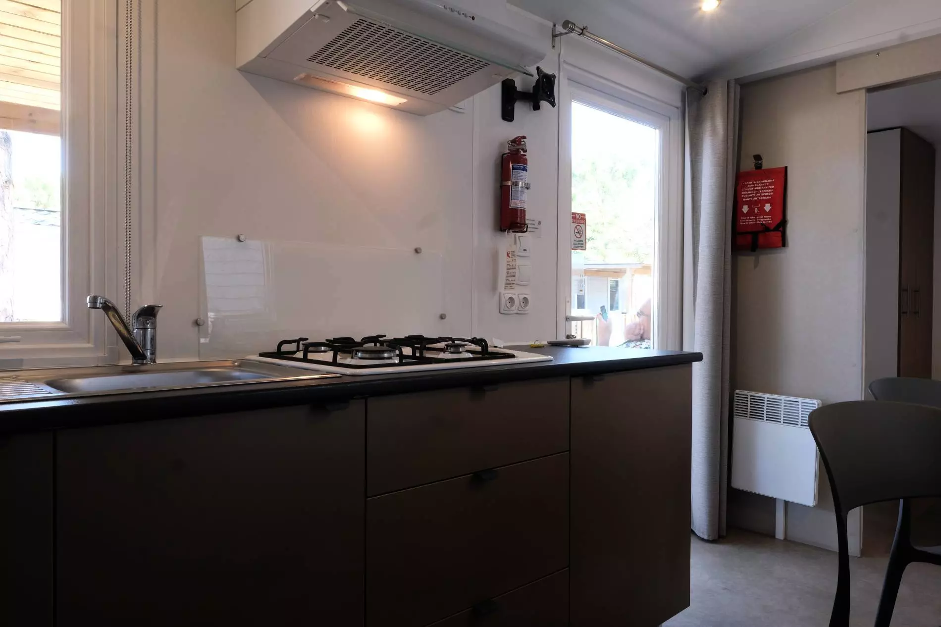 Le mobil home est équipé d'un réfrigérateur, de plaques de cuisson, d'une cafetière italienne et de mobilier de jardin sur la terrasse.