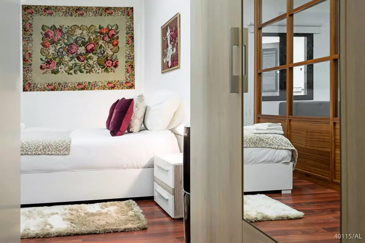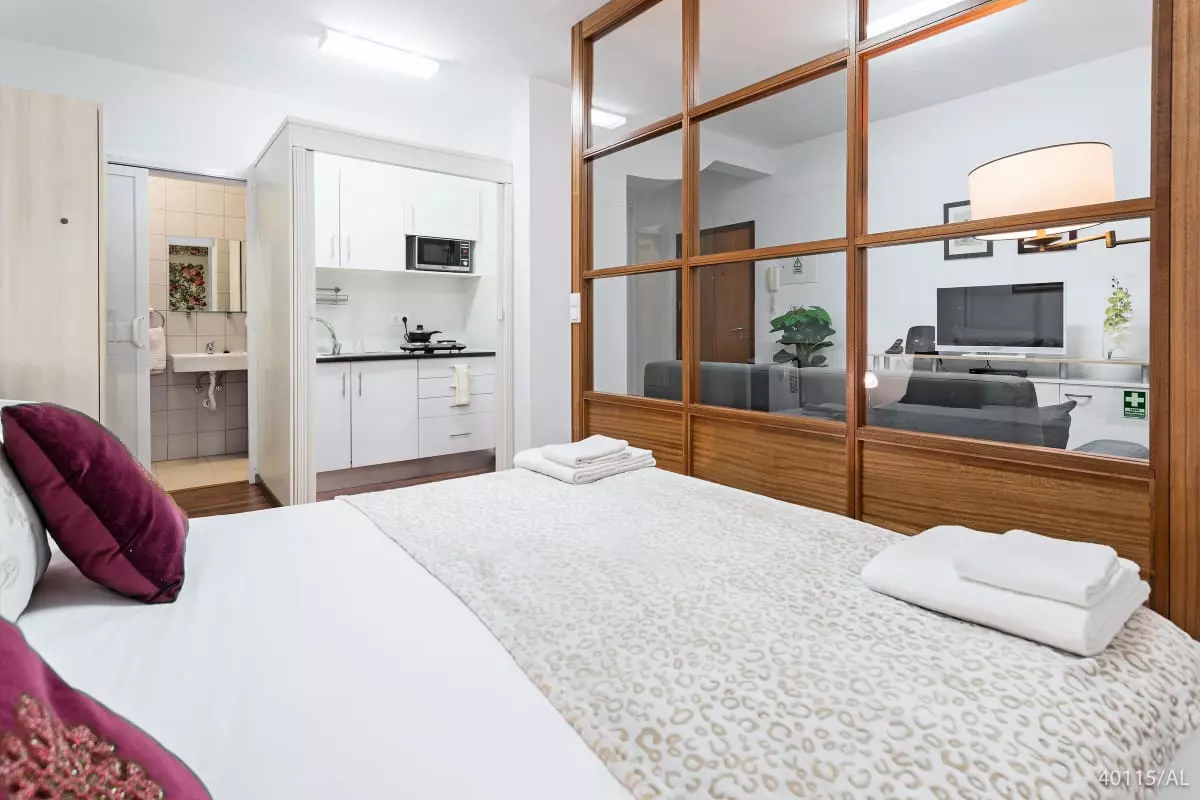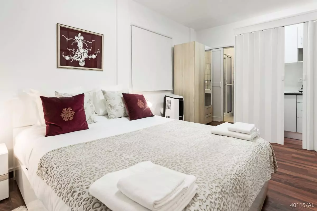 Ce studio moderne avec de grandes fenêtres dispose d'un lit double, d'une salle de bains avec douche, d'une kitchenette et d'un salon avec un canapé-lit double. Cet appartement est entièrement équipé de tout le confort : télévision, micro-ondes, wifi gratuit et climatisation.