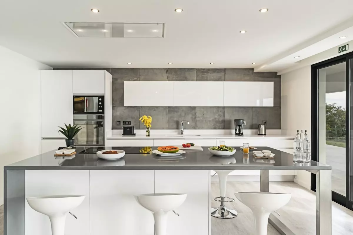 En plus de l'espace intérieur et de la grande cuisine entièrement équipée, la villa dispose d'un espace extérieur avec des zones de loisirs, un jardin et une belle piscine, prête à accueillir vos plongeons.
