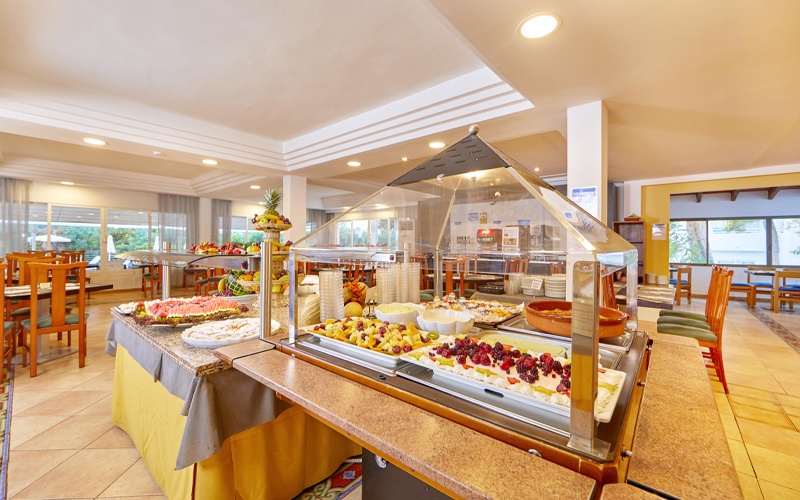 1 restaurant principal proposant une cuisine internationale sous forme de buffets, avec dîners thématiques selon le programme de la semaine. 1 bar salon et un autre près de la piscine.