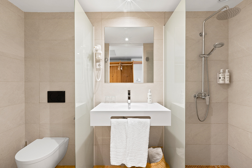 Salle de bains avec douche et sèche-cheveux