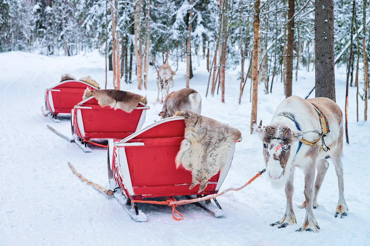 - **Traîneau à renne & Village du Père Noël (env. 5 h)** Départ en véhicule pour la visite d'une ferme de rennes et initiation à la conduite d'un traîneau à renne (env. 800 m). Cérémonie de passage du Cercle Arctique avec remise d'un certificat. Initiation à la conduite en motoneige pour les plus petits. Déjeuner puis continuation vers le Village du Père Noël. Temps libre pour le shopping.