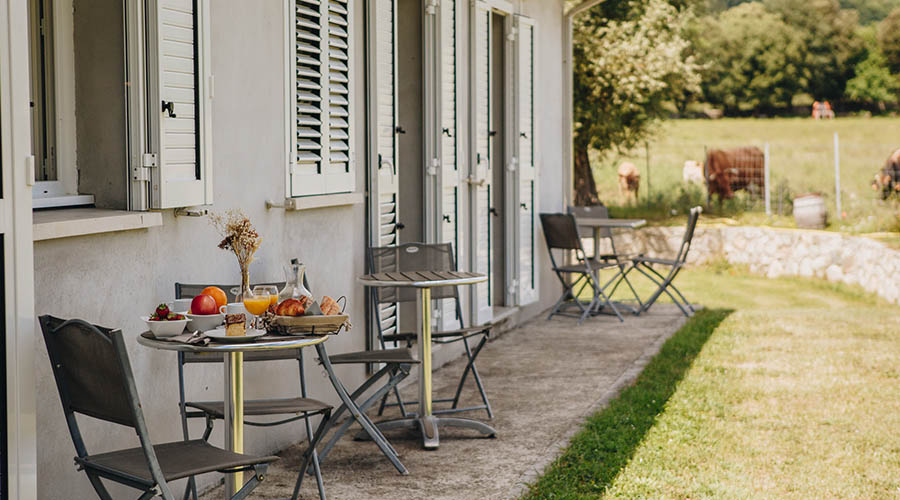Chaque matin, un petit déjeuner copieux vous est servi de 8h à 10h dans la salle de la ferme auberge, mettant à l'honneur les produits de la ferme. Le soir, sur réservation à l'avance, la demi-pension vous invite à savourer un menu élaboré avec des produits issus de la ferme ou de producteurs locaux. Dans une ambiance chaleureuse, chaque plat raconte une histoire, celle d'une terre généreuse et d'une passion partagée.