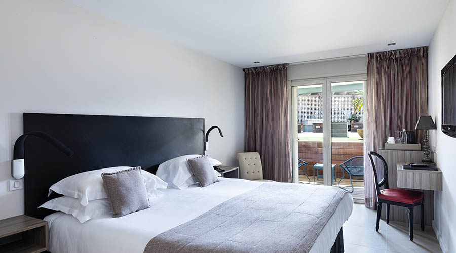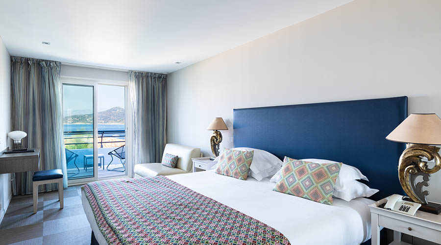 L'hôtel dispose de 56 chambres spacieuses réparties dans trois bâtiments de deux étages, desservies par des ascenseurs. Lumineuses et contemporaines, elles sont équipées d'une literie de qualité et proposées en plusieurs catégories : Standard (côté parking/jardin au rez-de-chaussée), Classique (vue mer lointaine depuis la terrasse en étage, ou côté jardin au rez-de-chaussée) et Supérieure Vue Mer. Certaines chambres sont communicantes, et des lits supplémentaires pour bébé ou enfant sont disponibles sur demande. L'occupation varie de single à quadruple (canapé-lit double selon le confort). Deux chambres Classique au rez-de-chaussée sont aménagées PMR (accès complet sauf à la plage).