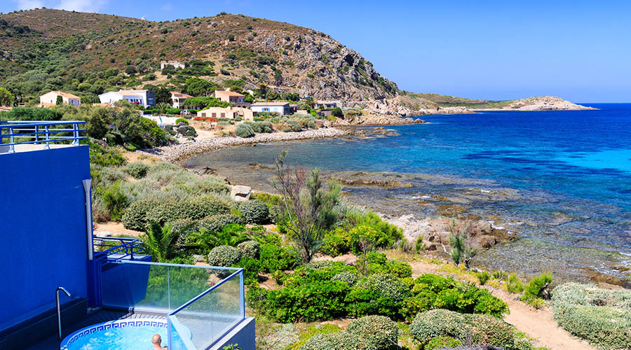 Profitez d'un bel espace piscine chauffée, avec bar et bain à remous (d'avril à octobre) offrant une vue panoramique. Une petite plage aménagée avec chaises longues et parasols se trouve juste en contrebas, avec serviettes et douches à disposition. À seulement 3 minutes à pied, découvrez restaurants et boutiques, et à proximité, profitez de tennis, excursions, sports nautiques et de nombreuses activités ludiques et sportives à Île-Rousse.