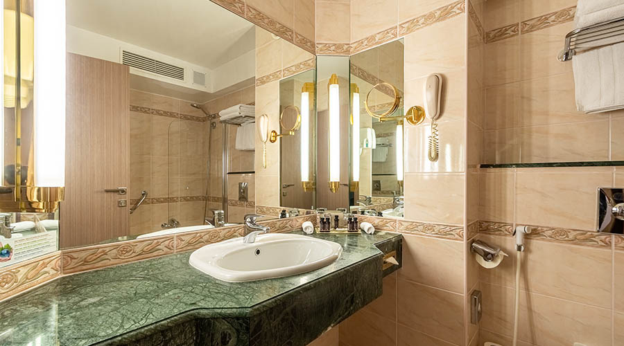 Toutes sont climatisées et possèdent une salle de bain en marbre (douche à l'italienne ou baignoire, sèche-cheveux, peignoirs, miroir loupe…). Coffre-fort. Accès Wifi gratuit. Téléphone, télévision satellite, radio, minibar, terrasse ou balcon. 2 communicantes en Classique Vue Jardin, nous consulter. Lit pour bébé en chambre Confort ou Luxe Panoramique avec supplément. Salon télévision, service journaux, bagagiste. Baby-sitting et pressing avec supplément. Parking privé, fermé et surveillé la nuit. Réception 24h/24. Conciergerie.