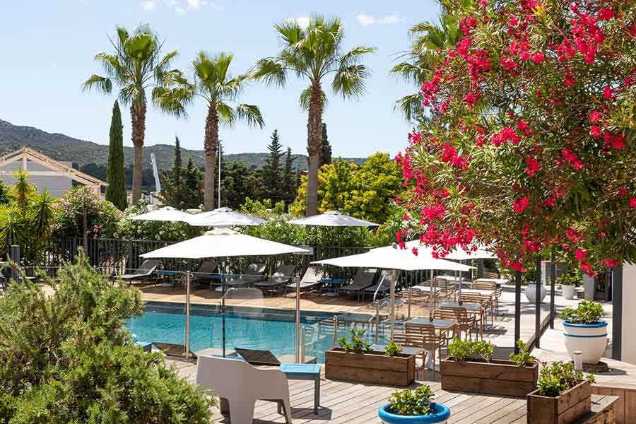L'espace piscine, entouré de palmiers et chauffée selon la météo, offre un véritable coin de détente avec solarium, chaises longues et parasols.