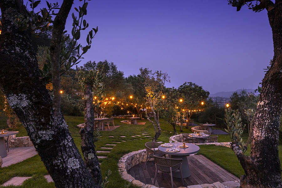 Cuisine corse revisitée avec justesse par un chef étoilé, servie sous les oliviers.