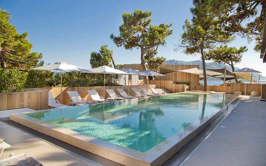 Piscine chauffée et plage privative, équipées de chaises longues, parasols, serviettes et douche pour profiter confortablement de moments de farniente.