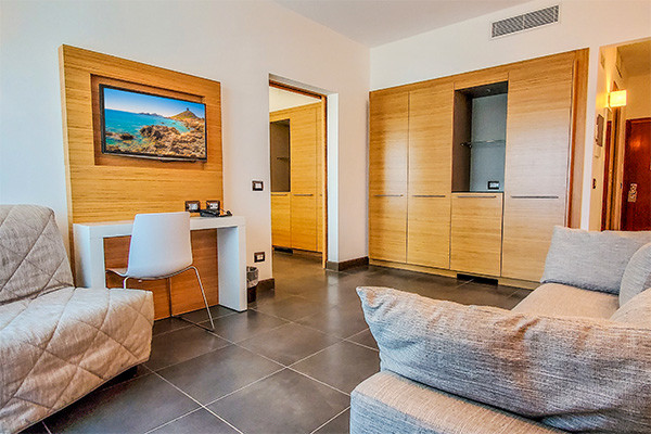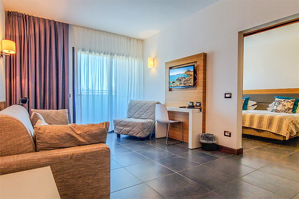 • Suite vue mer située au 3ème et dernier étage (50 m²) : une chambre avec un lit double ou 2 lits séparés, salon communicant avec un canapé convertible en lit en 140 cm et une chauffeuse en 80 cm (pouvant accueillir un enfant de moins de 13 ans), 2 loggias, 2 salles de bain (1 avec douche et 1 avec baignoire), 2 coffres-forts, 2 mini-réfrigérateurs. Capacité maximale : 3 adultes + 1 enfant.