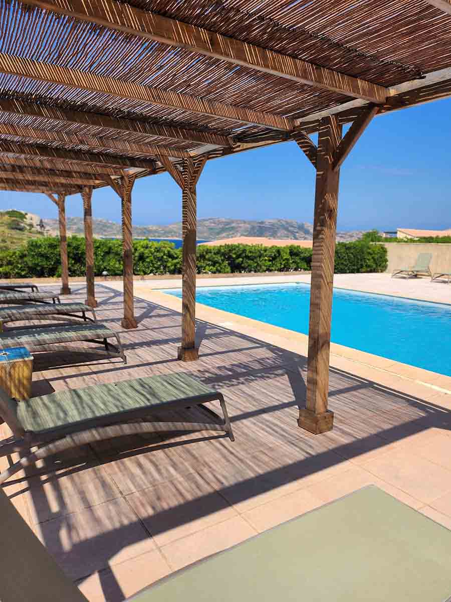 Profitez d'une piscine agréable avec vue sur la pointe de la Revellata, équipée de chaises longues, douche et pergola. Le centre de Calvi et ses animations sont accessibles à seulement quelques pas.