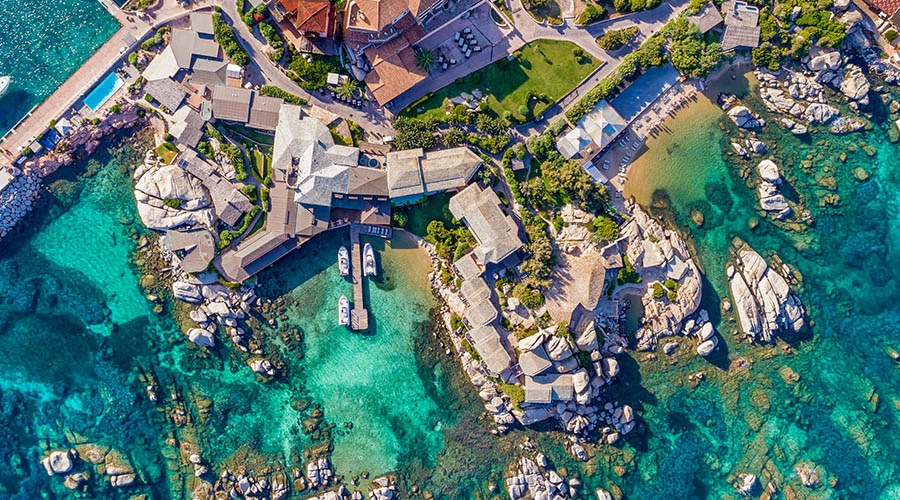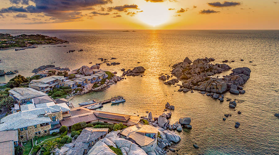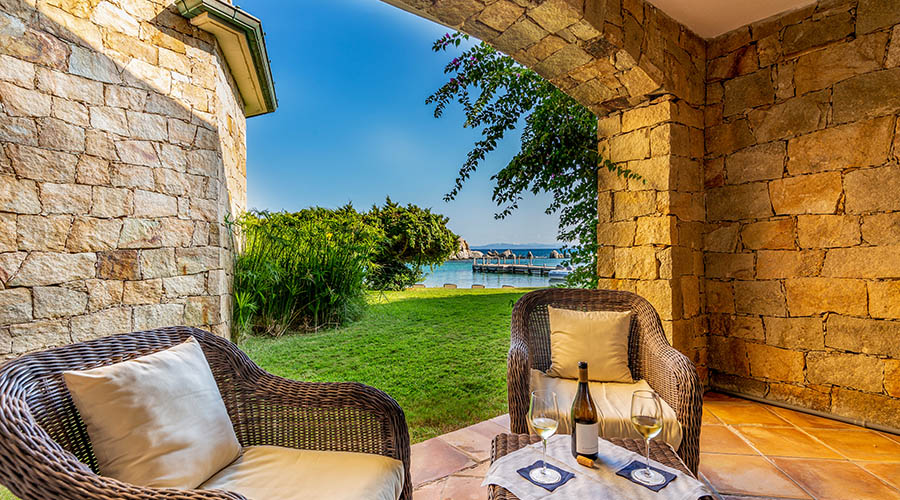 Au large de Bonifacio, à l'extrémité de l'île de Cavallo, un merveilleux hôtel mêlant pierres et bois.