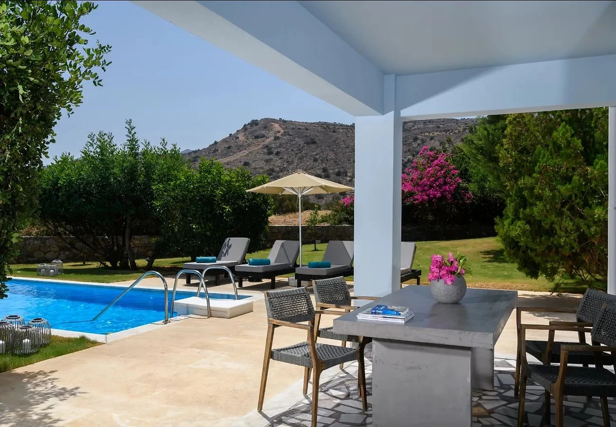 Toutes les suites offrent la vue jardin ou la vue mer, un bain à remous ou une piscine privée, des salles de bains en marbre ou granit avec baignoire et douche, TV satellite, WiFi haut débit, air conditionné, service de chambre 2 fois/jour, menu oreiller, service en chambre 24h/24 et dîner possible en suite sur demande et extra, mini-bar, nécessaire thé/café gratuit, sèche-cheveux, planche et fer à repasser, coffre-fort gratuit, bouteille d'eau et de vin grec à l'arrivée, machine Expresso avec capsules en supplément.