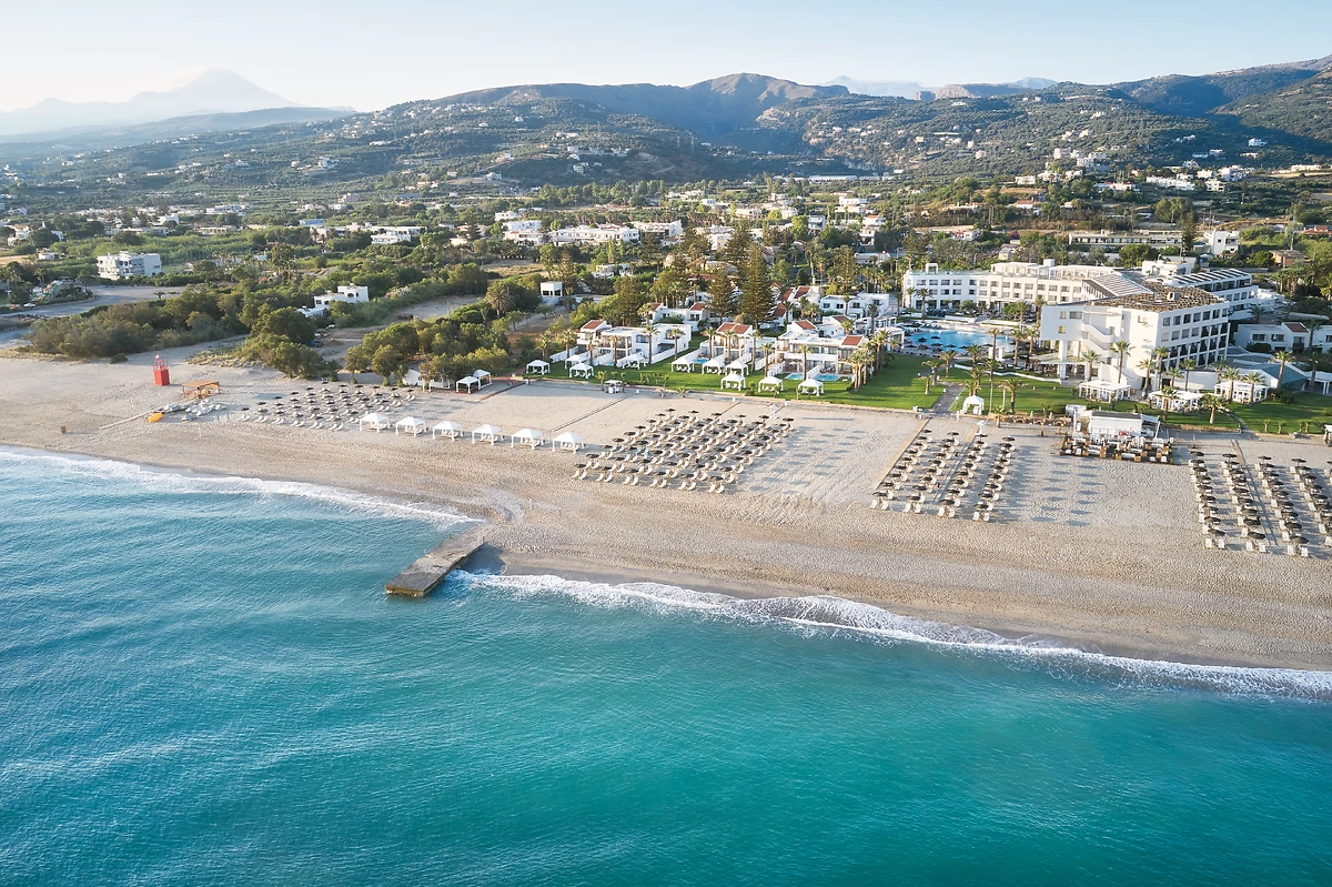 À 1 h environ de l'aéroport d'Héraklion ou de celui de La Chanée, au calme sur une plage de sable blond mais à proximité immédiate de la ville de Réthymnon et de ses animations.