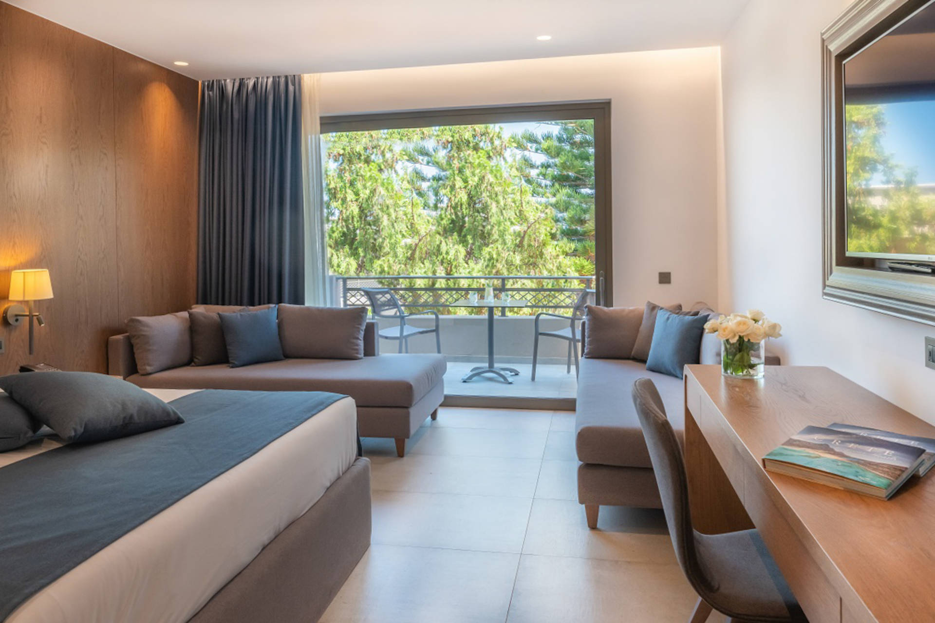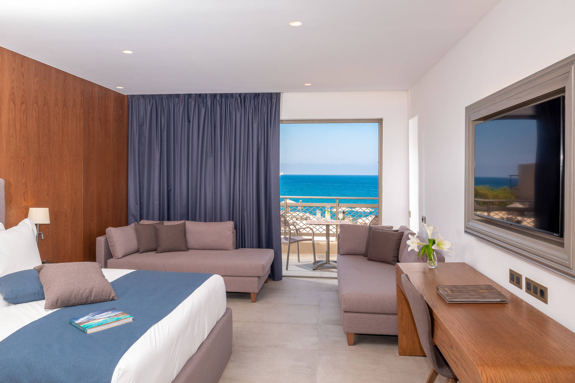 La chambre famille open plan vue mer. Cette chambre de 29 à 32 m² aux équipements identiques à la chambre famille open plan vue jardin vous invite à profiter chaque jour d'une vue imprenable et apaisante sur la mer. Un véritable havre de paix. Capacité maximum : 4 adultes.